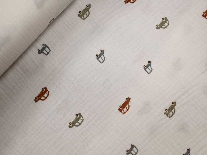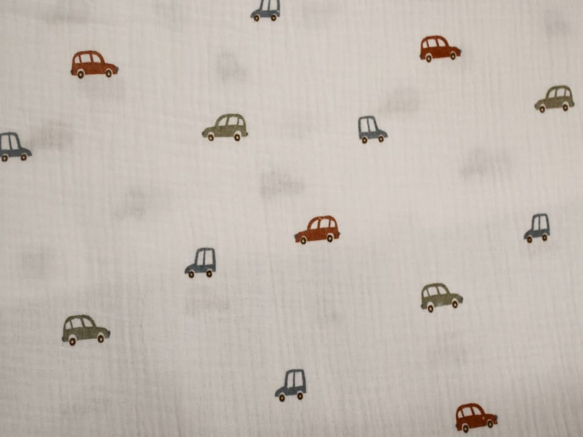 Esta muselina 100% algodón presenta un encantador estampado de pequeños coches en colores tierra, azul y gris, sobre fondo crudo. Con un ancho de 140 cm y un gramaje de 130 gr/m², es perfecta para proyectos de confección delicados, especialmente pensados para los más pequeños.