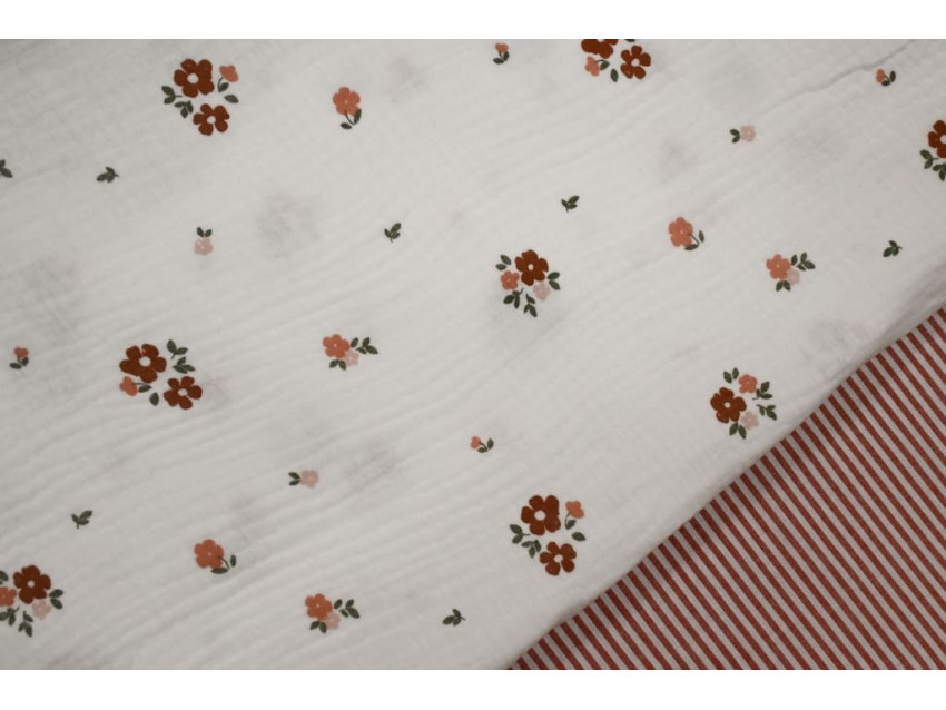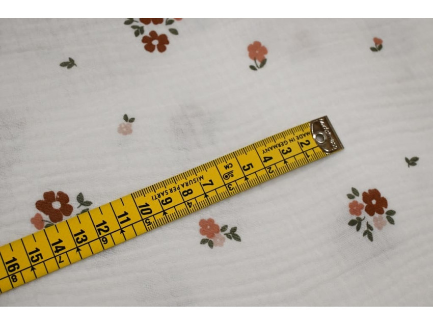 Gracias a su textura aireada y natural, esta muselina resulta perfecta para arrullos, gasas, baberos, sábanas de cuna, mantitas ligeras, blusas veraniegas y vestidos frescos. Su diseño floral pequeño y espaciado le da un toque dulce, pero sin sobrecargar, lo que la convierte también en una opción preciosa para proyectos de decoración infantil, como cojines o cortinas ligeras.