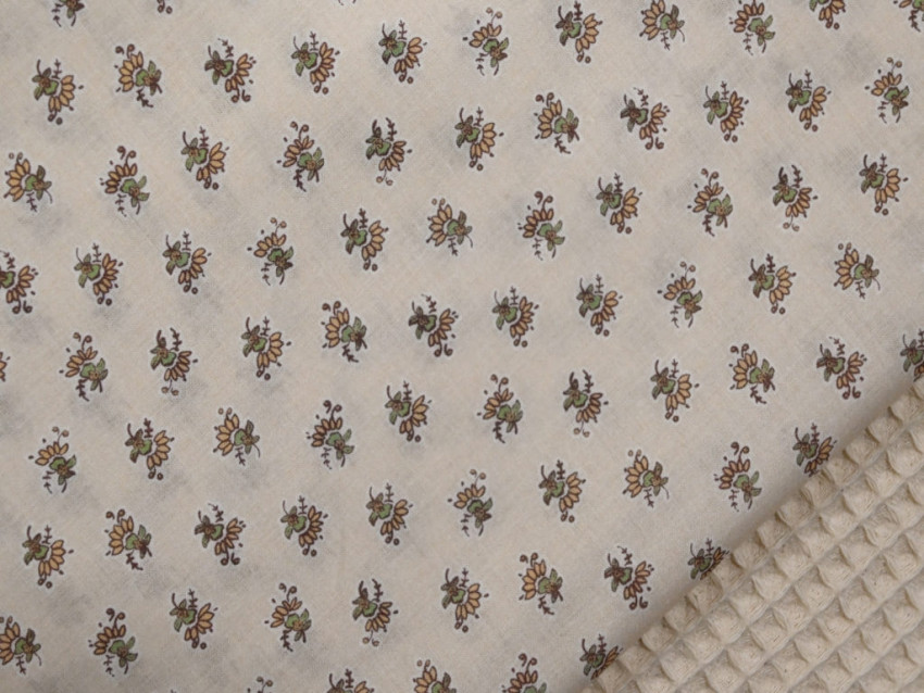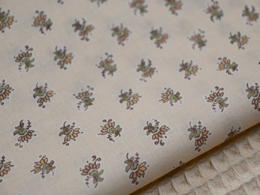 Su estampado floral de inspiración vintage, en tonos mostaza, verde seco y marrón sobre fondo crema, le da un aire romántico, cálido y atemporal. Es perfecto para confeccionar blusas, camisas, vestidos ligeros, pijamas, camisones, pañuelos o ropa infantil fresca y natural.