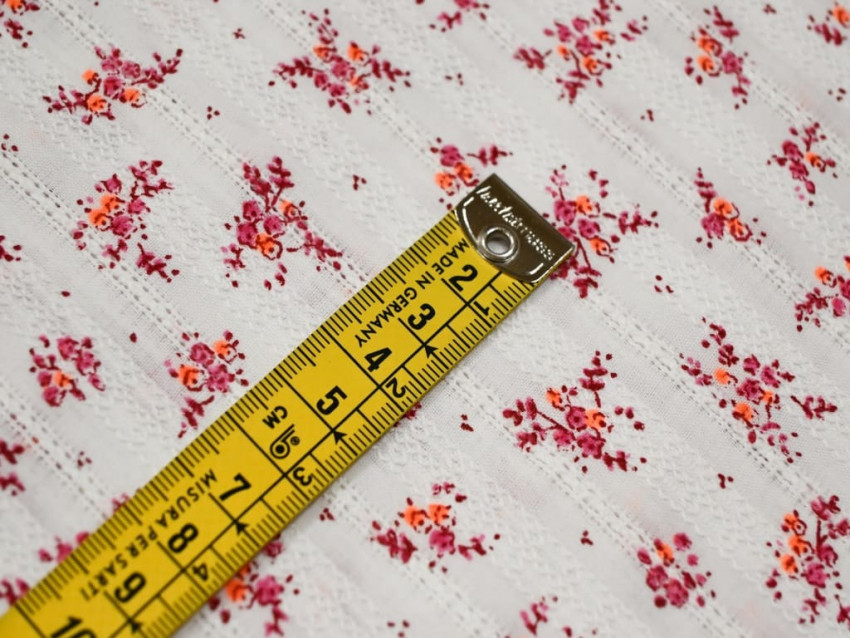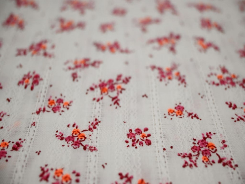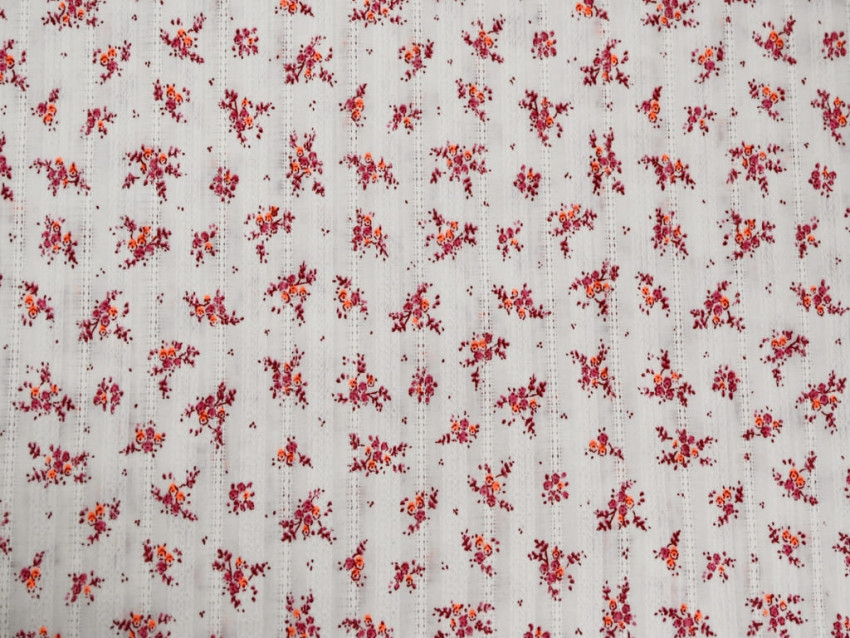 Algodón 100% estampado con pequeñas flores y calado decorativo.