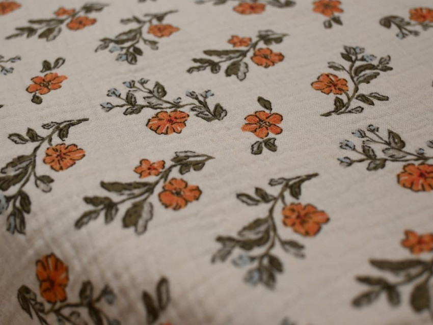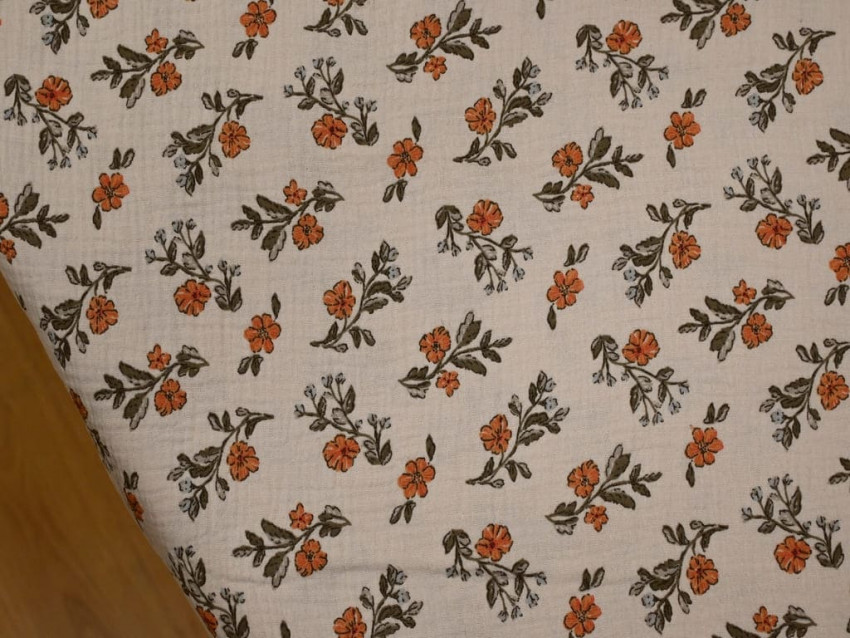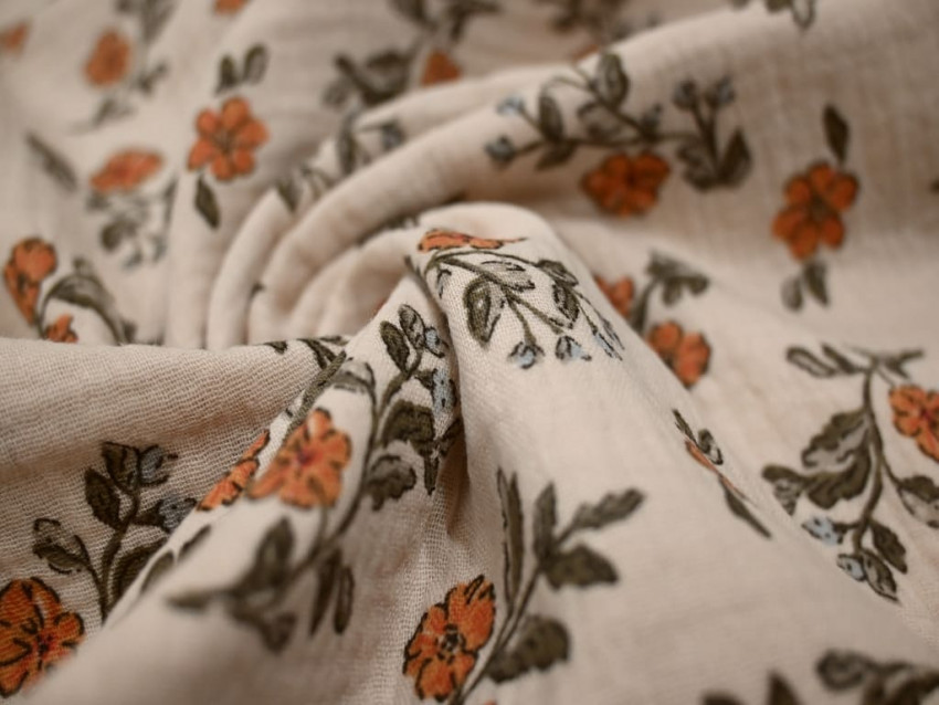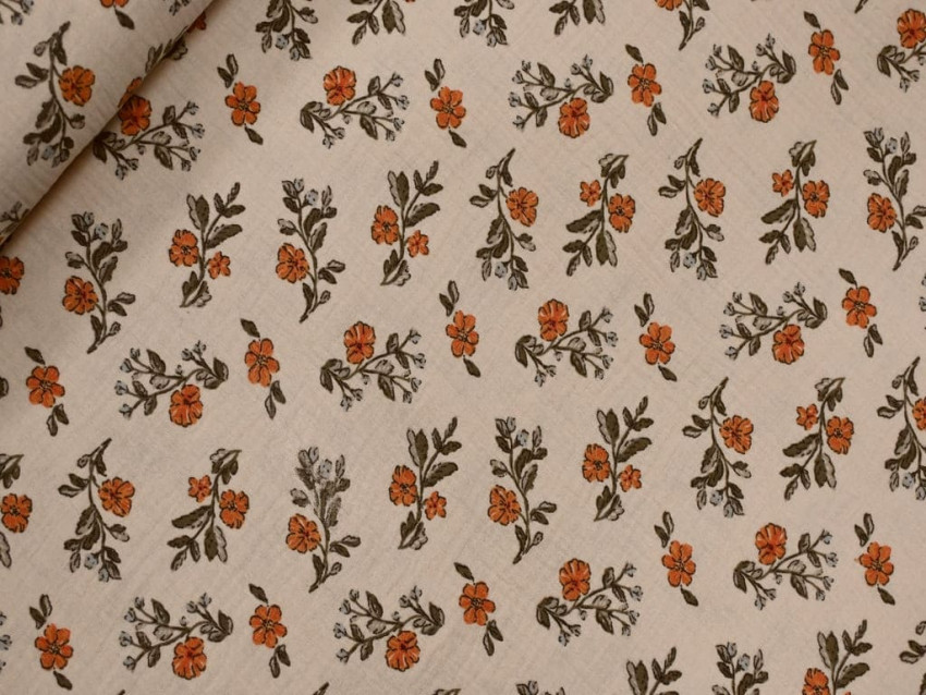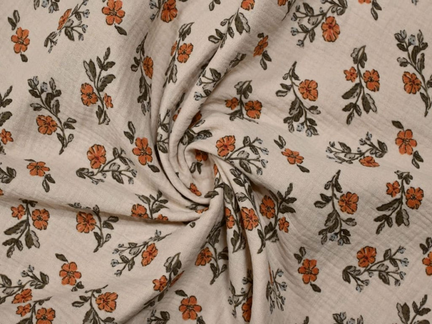 Muselina de algodón 100% con estampado floral en tonos tierra. Suave, ligera y transpirable. Ideal para prendas infantiles, moda casual y proyectos delicados.
