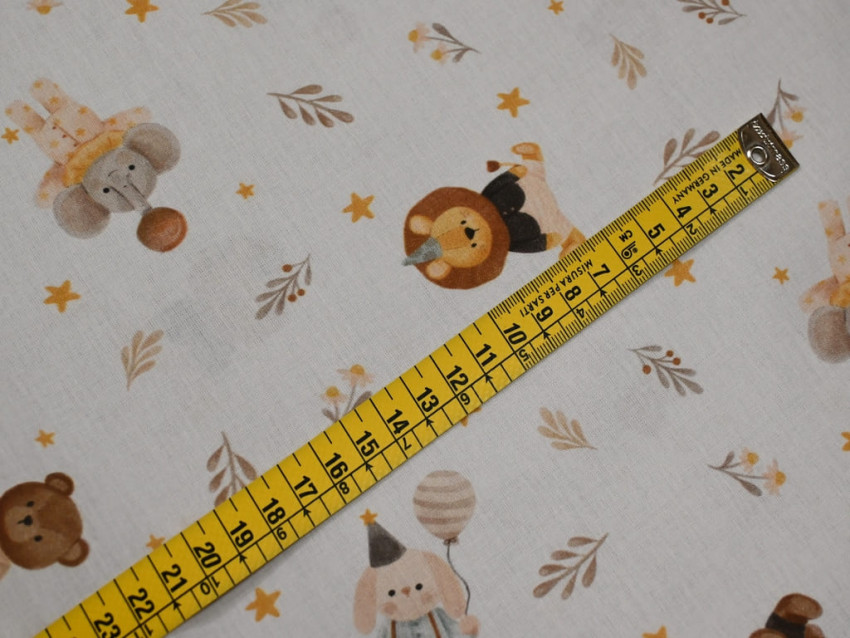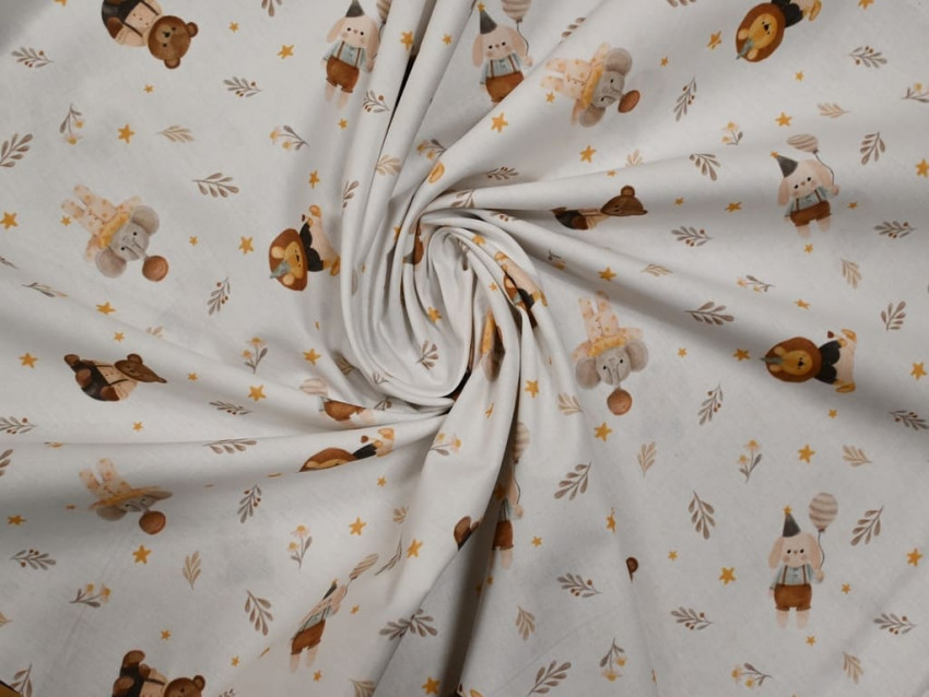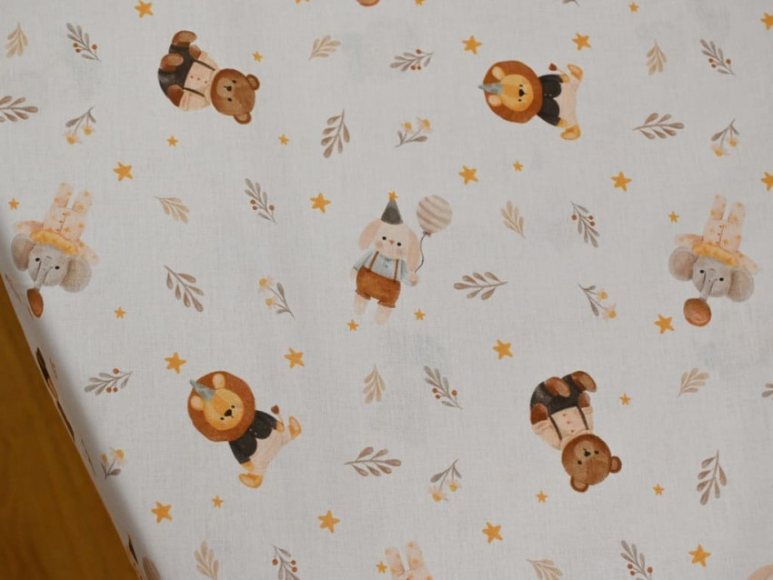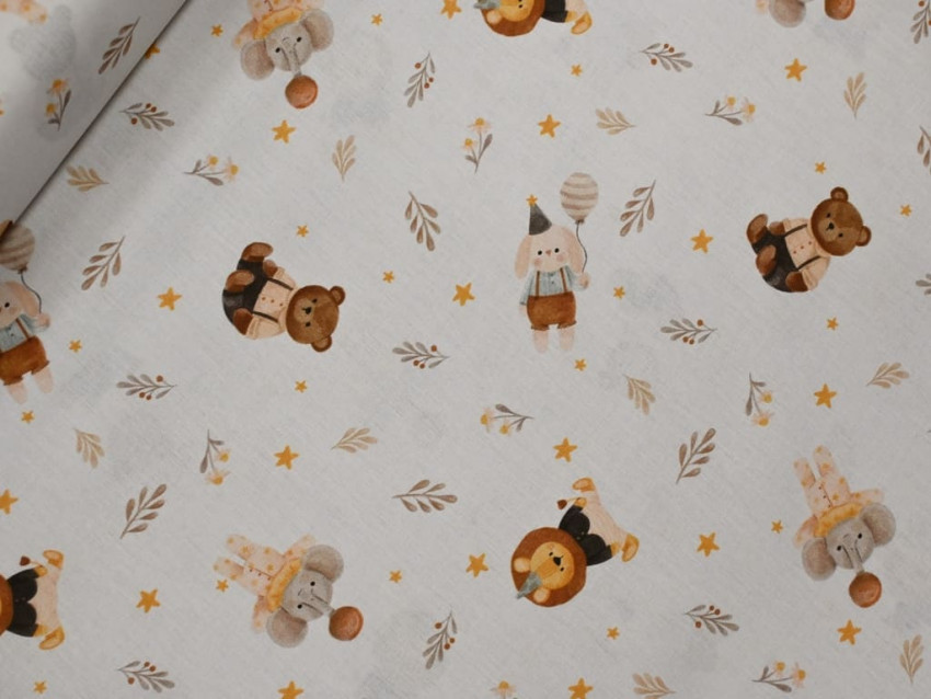 Este popelín infantil de algodón 100% presenta un alegre y entrañable estampado de temática circense, protagonizado por simpáticos animales como leones, elefantes, ositos y conejitos con globos y sombreritos de fiesta, todo sobre un fondo blanco decorado con hojitas y pequeñas estrellitas en tonos tierra y mostaza.