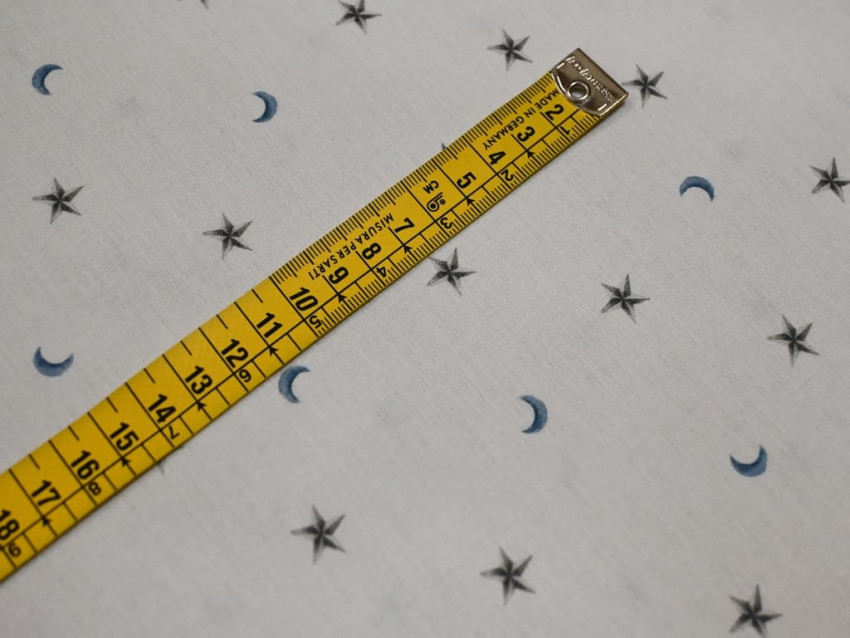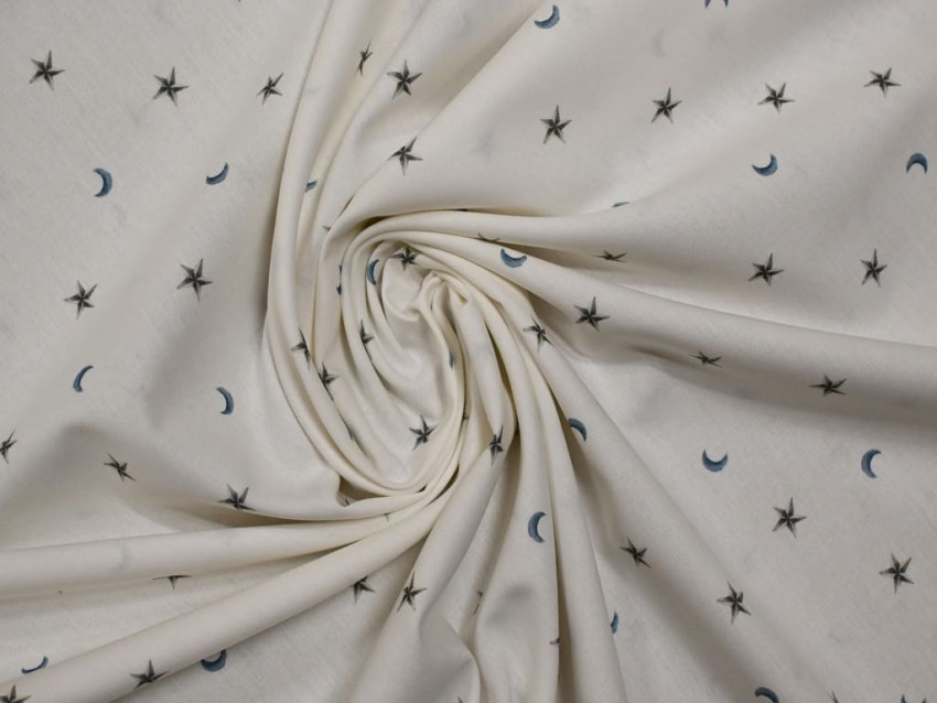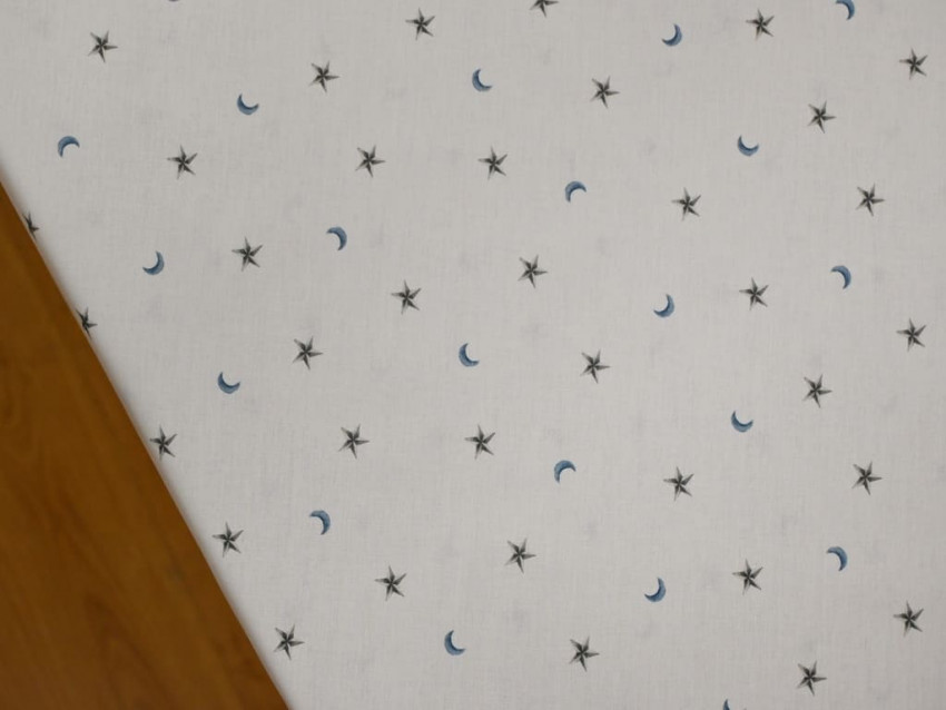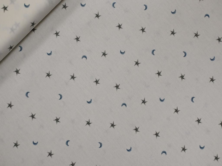 Popelín 100% algodón con delicado estampado de lunas y estrellas sobre fondo blanco.
