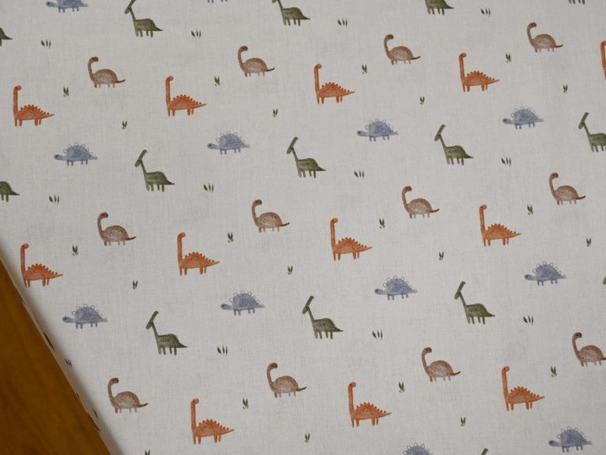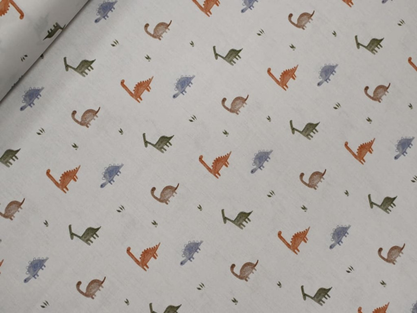 Popelín 100% algodón con simpático estampado de dinosaurios en tonos suaves.
