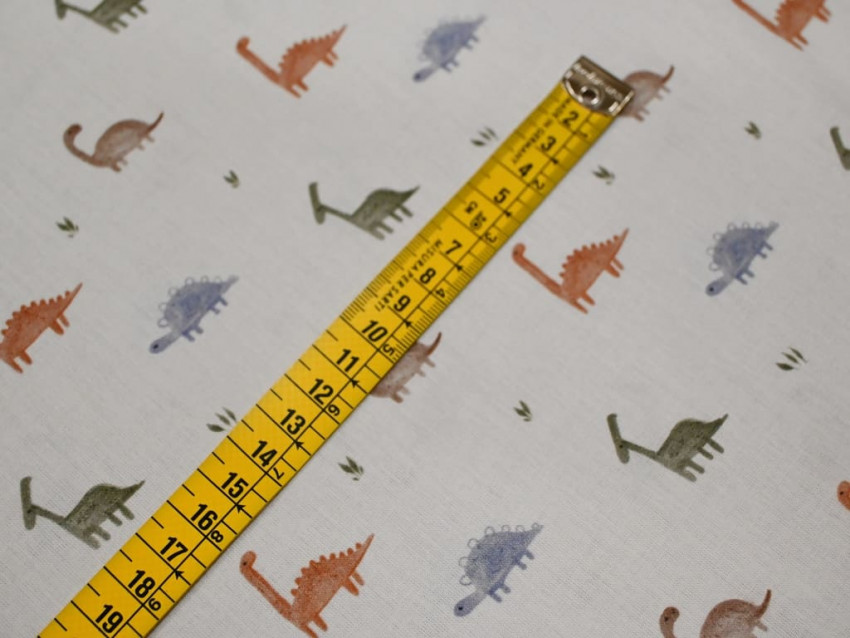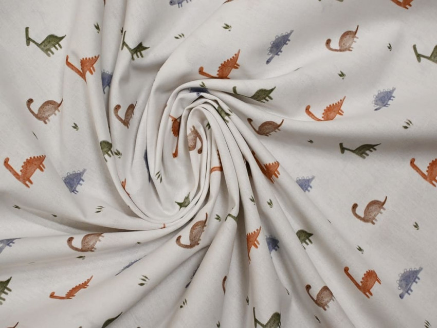 Este popelín de algodón 100% destaca por su diseño divertido y lleno de ternura: pequeños dinosaurios ilustrados en tonos tierra, verdes y azules sobre fondo blanco. Un tejido perfecto para proyectos infantiles que buscan un acabado alegre, natural y cómodo.