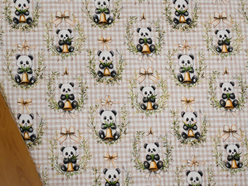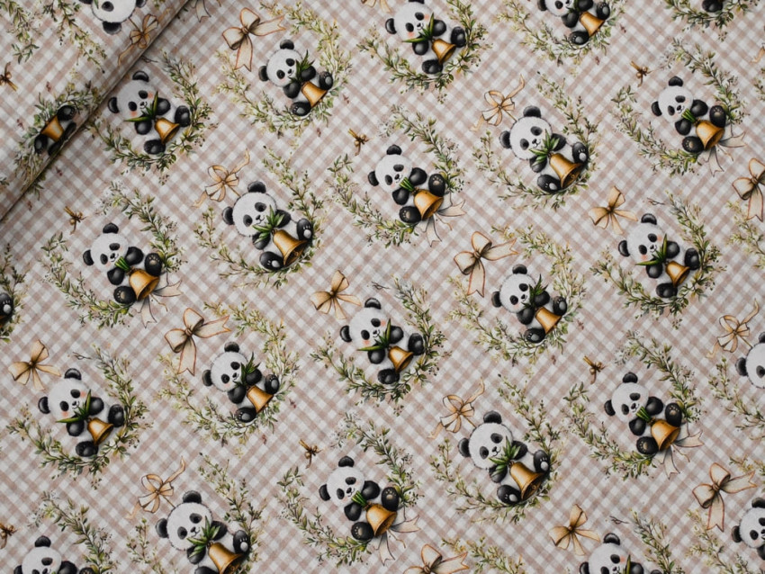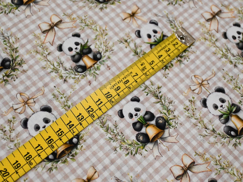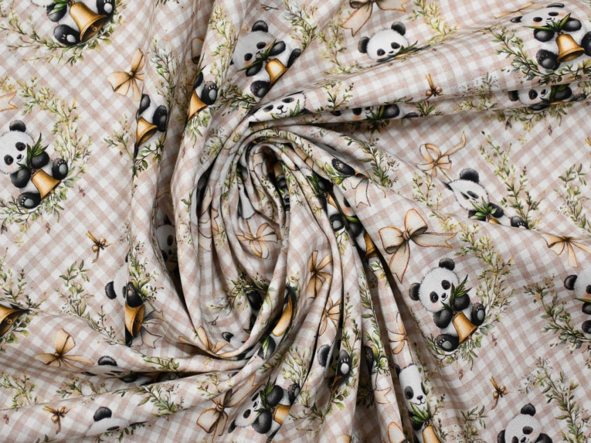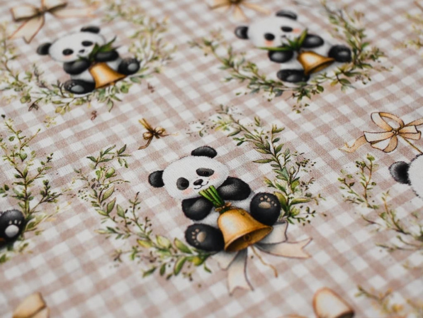 Popelín 100% algodón con dulce estampado de pandas y lazos sobre fondo vichy beige.
