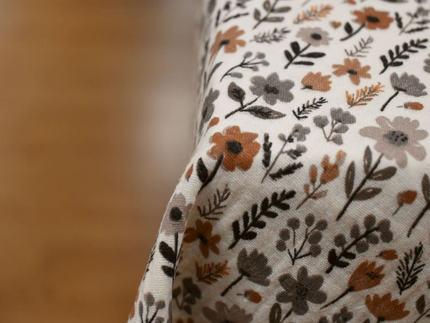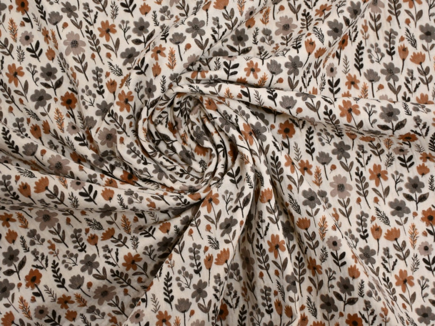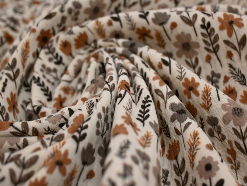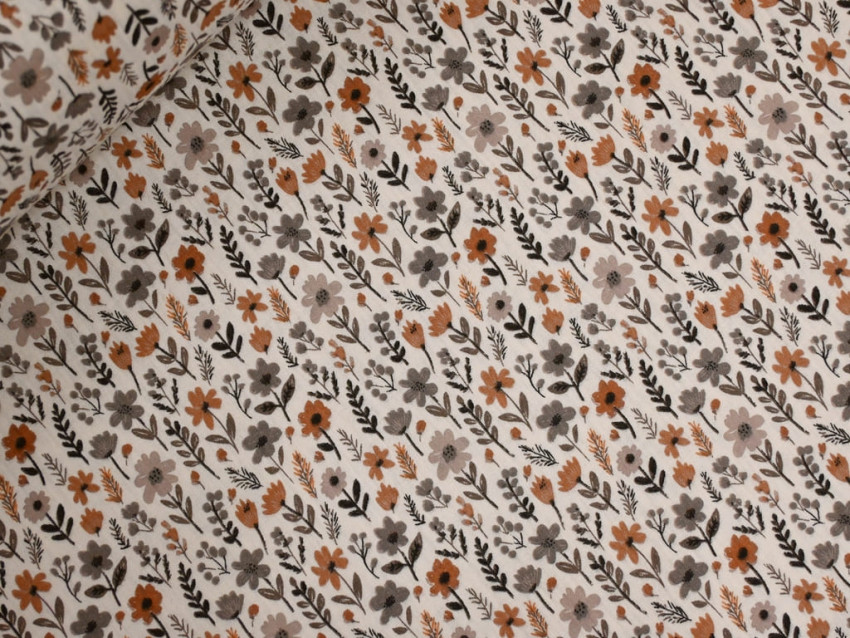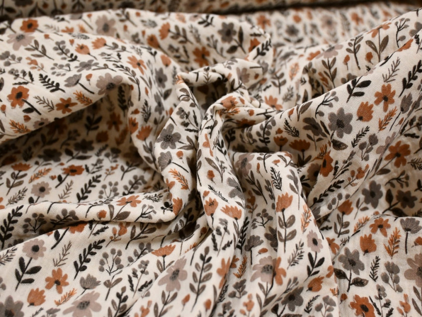 Tela de muselina 100% algodón con estampado floral en tonos tierra, gris y negro. Suave, ligera y versátil, ideal para moda infantil, femenina y decoración con estilo natural.
