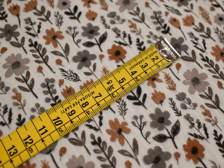 Esta tela de muselina de algodón 100% tiene un gramaje de 130 g/m² y un ancho de 135 cm. Su textura presenta el clásico arrugado natural de la muselina, con un tacto muy suave y agradable, ideal para pieles sensibles. Se trata de un tejido transpirable y ligero, con buena caída y una estética casual pero cuidada. El estampado floral, en una paleta de grises, marrones, beige y negro, le confiere un estilo otoñal y sobrio, muy fácil de combinar.