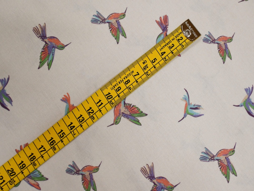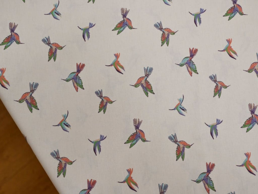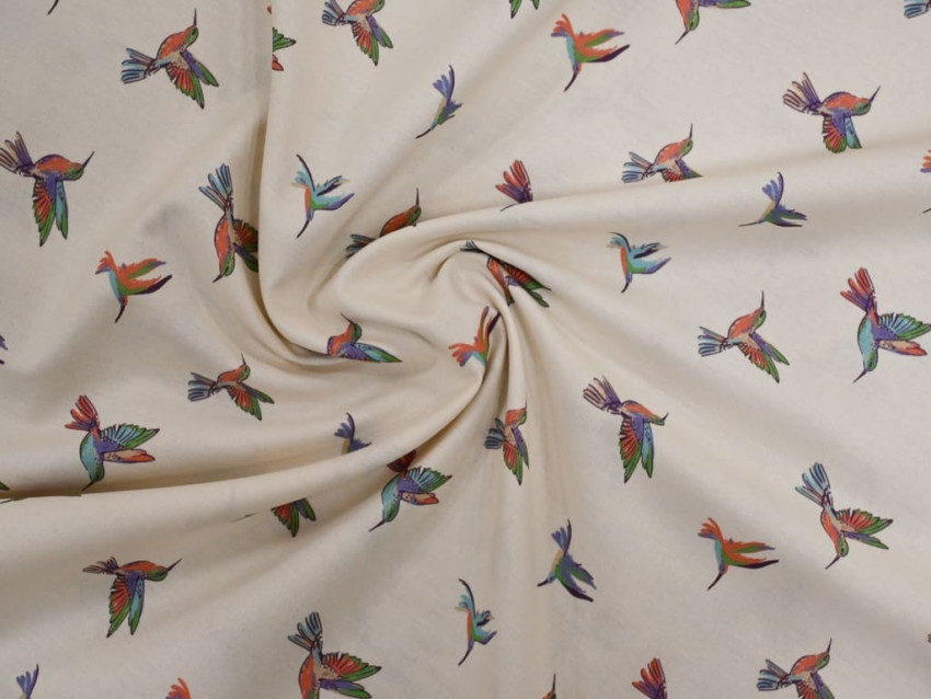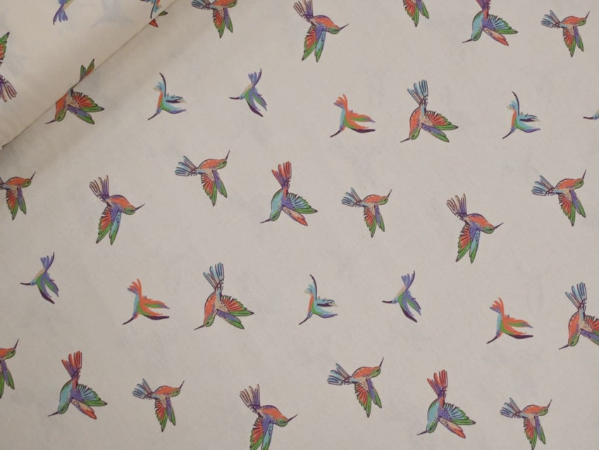 Popelín 100% algodón con delicado estampado de colibríes multicolor sobre fondo claro. Tejido ligero, suave y fresco, perfecto para moda infantil, camisas, vestidos y proyectos creativos llenos de color.