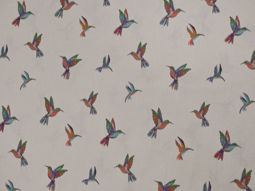 Este popelín de algodón 100%, con un gramaje de 110 g/m² y 140 cm de ancho, presenta un alegre estampado de colibríes en tonos vivos —verde, azul, coral y violeta— sobre fondo claro. El diseño transmite ligereza, movimiento y frescura, ideal para prendas cómodas y con un punto original.