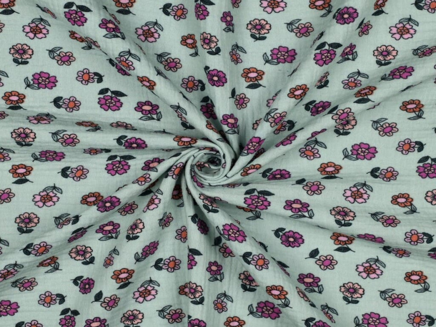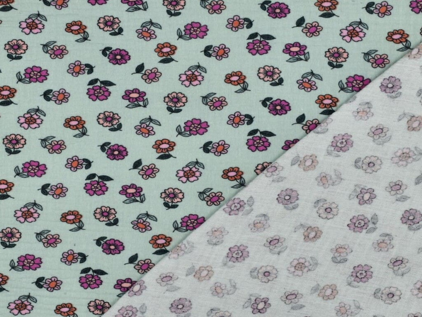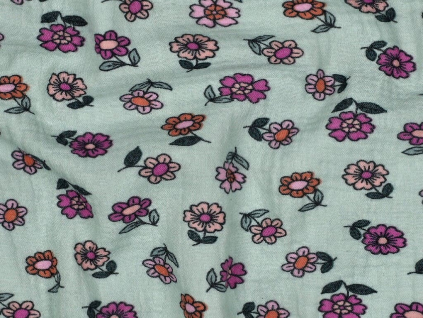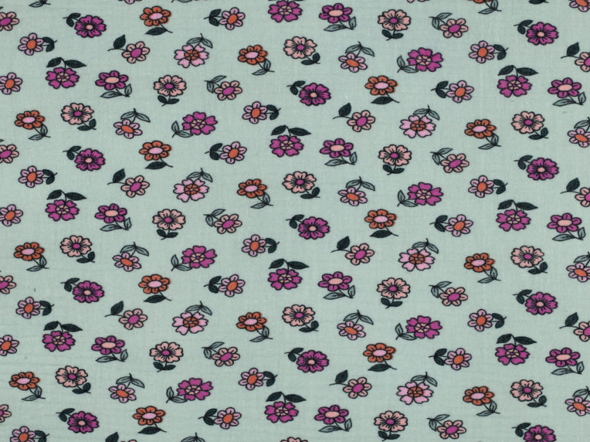 Muselina 100% algodón estampada con pequeñas flores en tonos fucsia, rosa y coral sobre fondo verde agua suave. 115 g/m² y 135 cm de ancho. Ligera, fresca y transpirable, ideal para prendas infantiles, blusas y vestidos delicados.