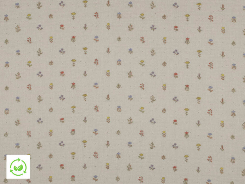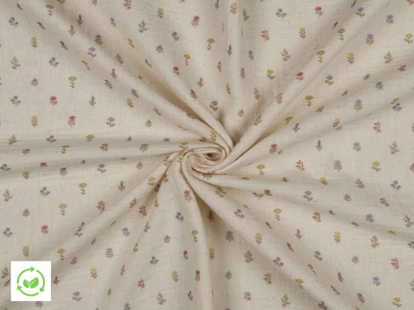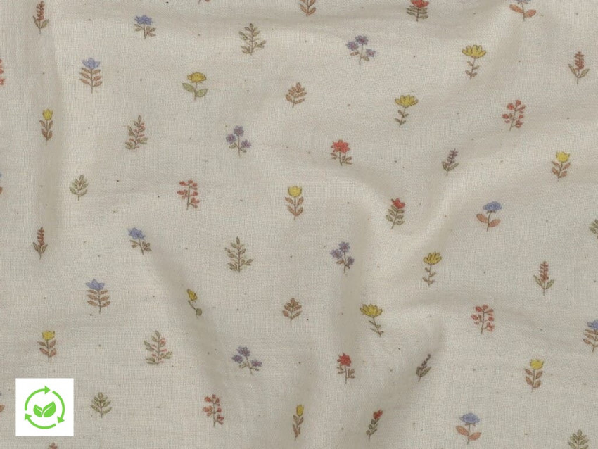 Muselina 100% algodón con certificado GOTS, ultraligera (120 gr/m²) y 135 cm de ancho. Estampado floral delicado sobre fondo natural. Transpirable, suave y sostenible, perfecta para prendas infantiles, bebé y moda fresca de verano.