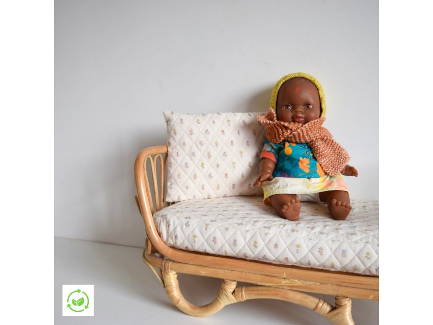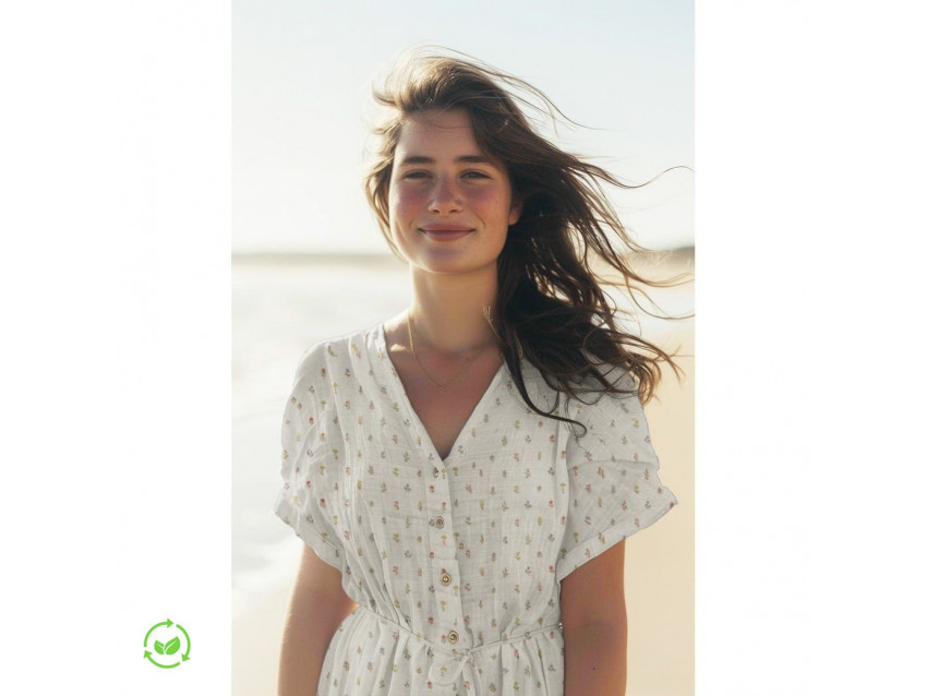 Esta muselina estampada de pequeñas flores está confeccionada en 100% algodón orgánico con certificado GOTS (Global Organic Textile Standard), garantizando un tejido respetuoso con la piel y con el medio ambiente en todas las fases de producción.