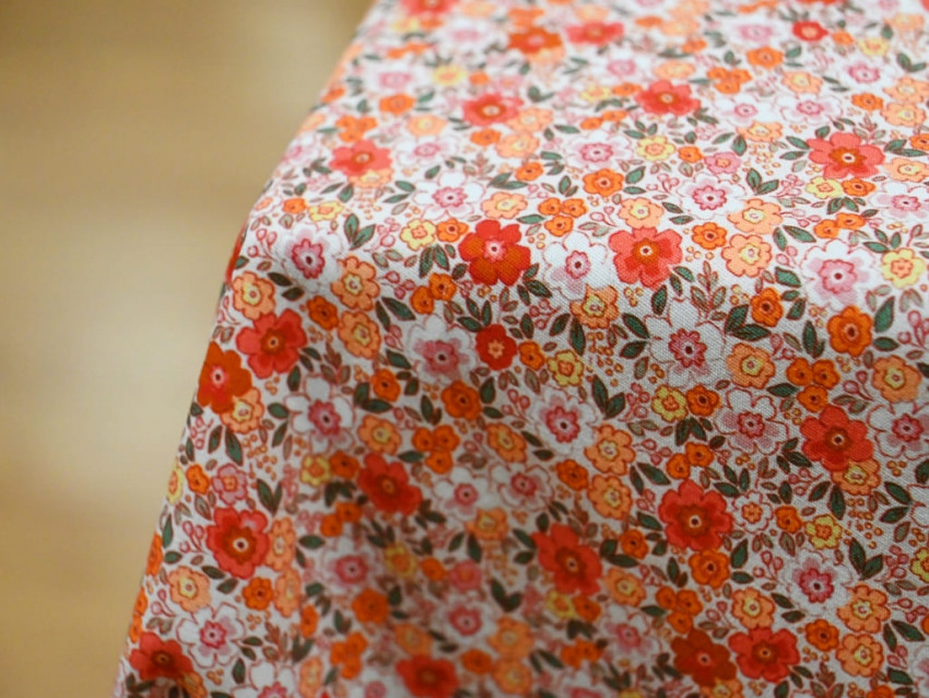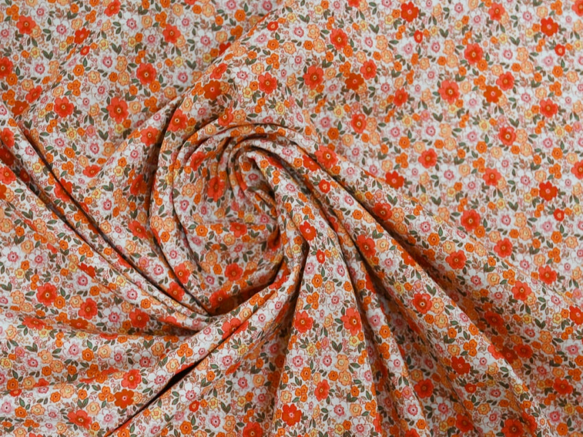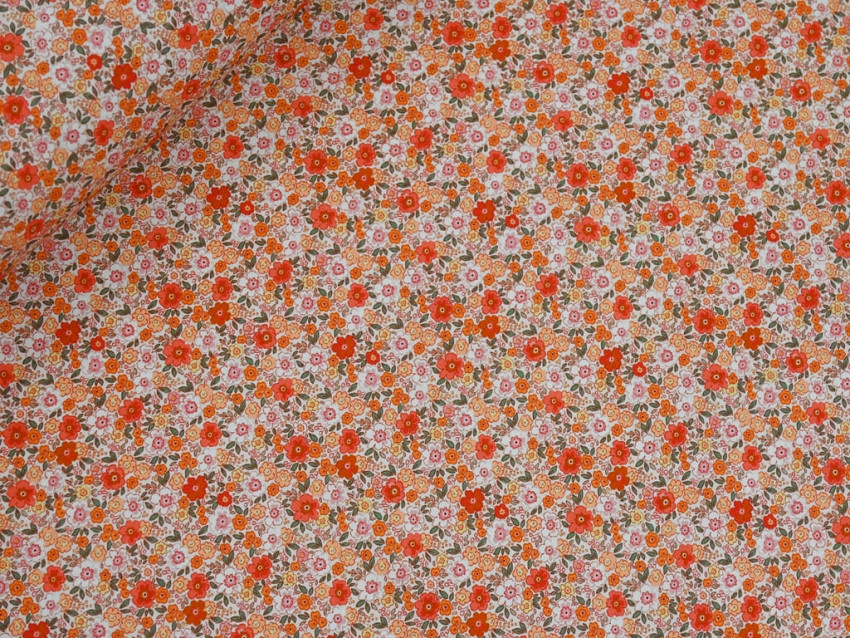 Este popelín de algodón 100% mantiene la misma calidad excepcional, ahora reinterpretado en una paleta cromática más cálida y vibrante. Su estampado floral tipo liberty en tonos coral, rojo y rosa aporta luminosidad y energía, sin perder la delicadeza característica de este tipo de diseño.