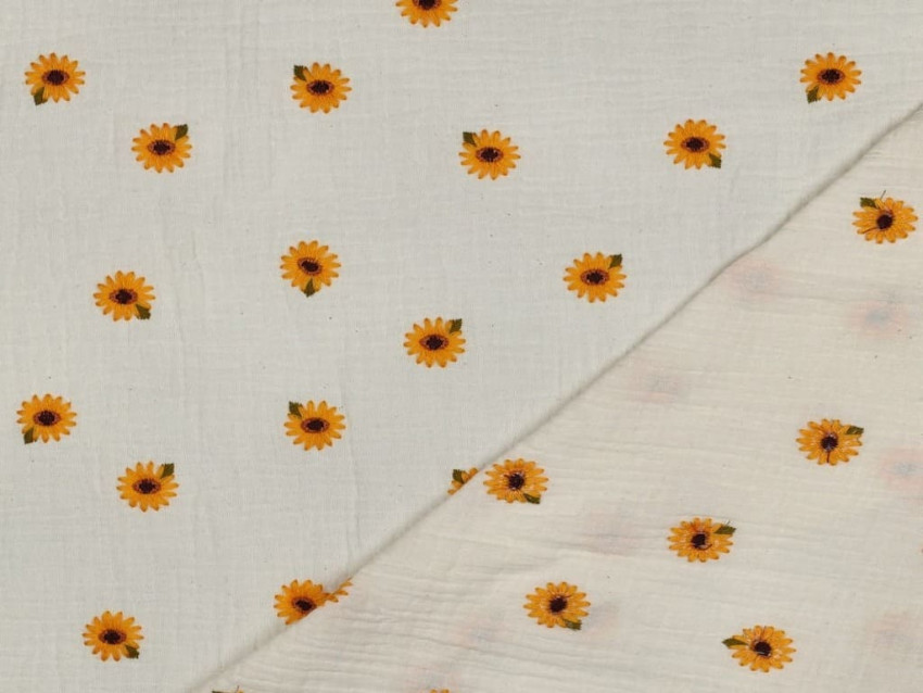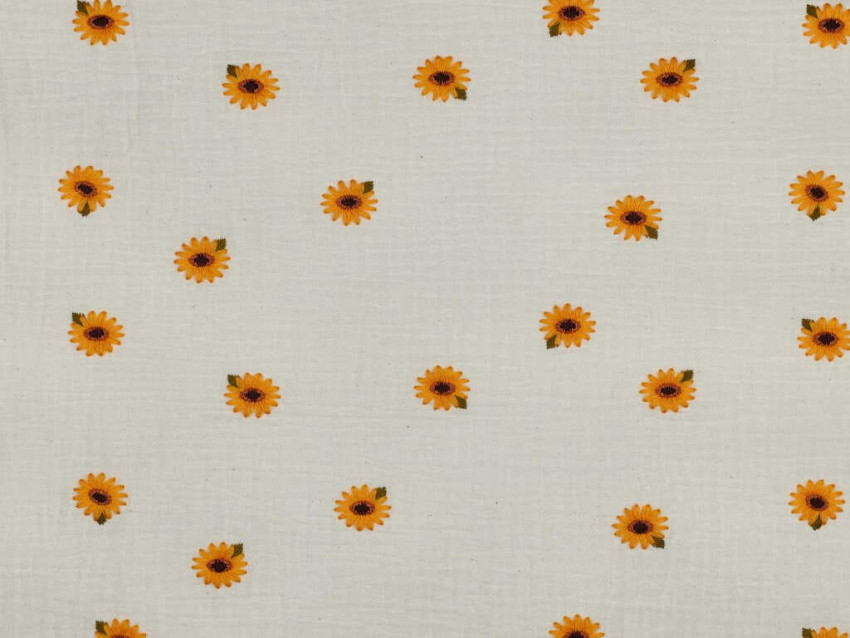 Muselina bordada de algodón 100% con delicadas flores tipo margarita. Tejido ligero, suave y transpirable, ideal para prendas frescas, infantiles y de verano.