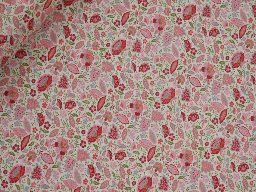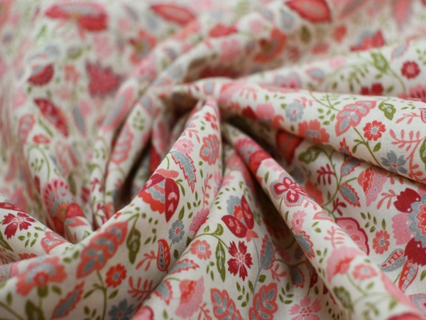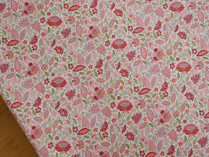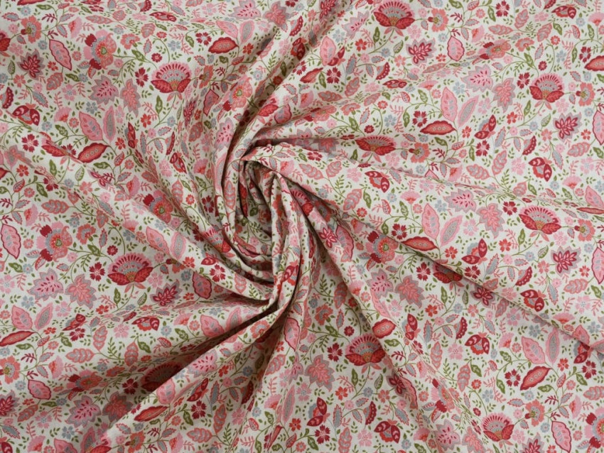 Su acabado fino y ligeramente translúcido aporta ese toque delicado tan característico del voile. El estampado combina flores y motivos vegetales en tonos rosados, verdes y rojizos, creando un diseño armonioso, femenino y muy fácil de llevar.