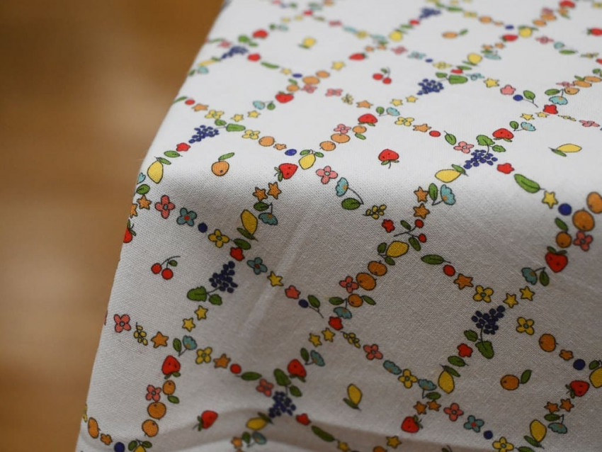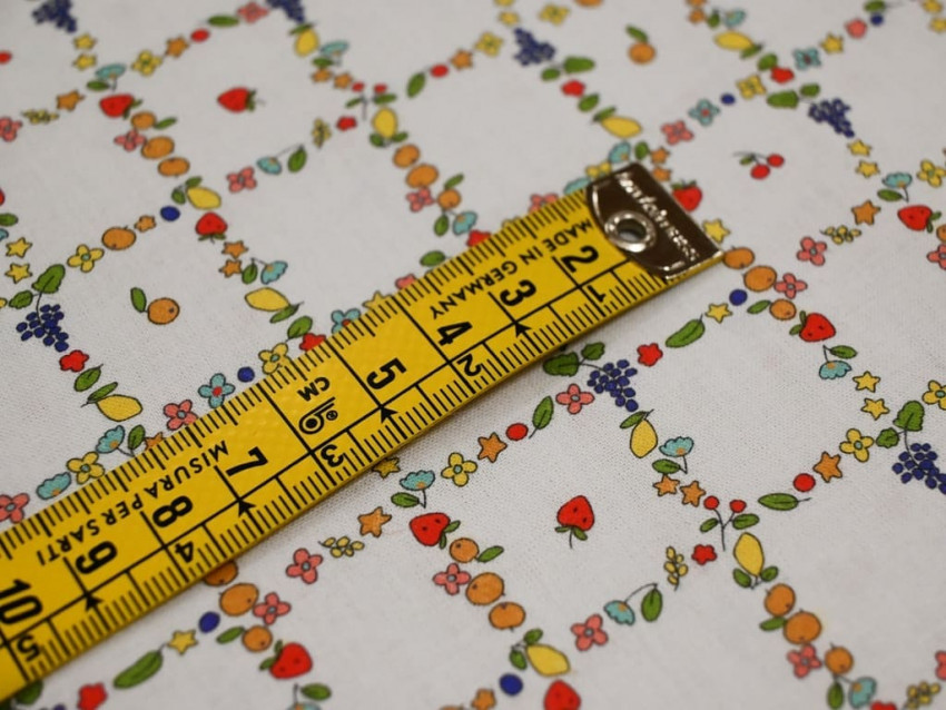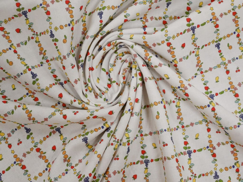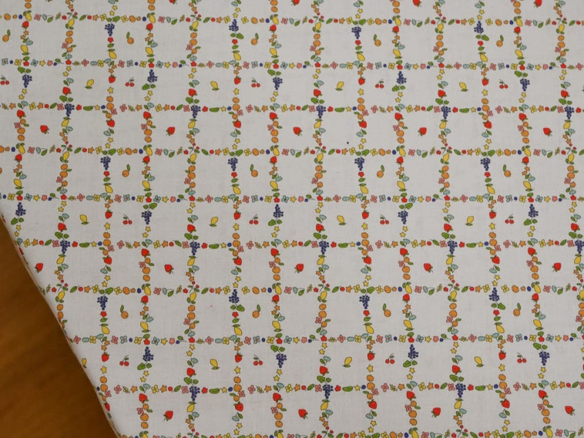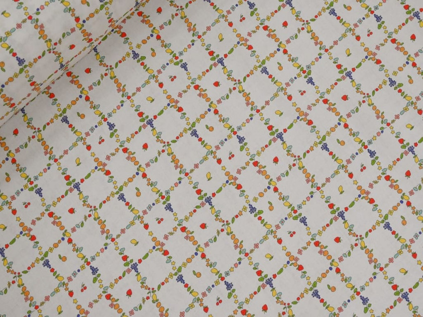Presenta un estampado alegre y detallado que combina flores, frutas y pequeños motivos en una estructura geométrica tipo rejilla, sobre fondo claro. El resultado es un diseño fresco, original y muy versátil.