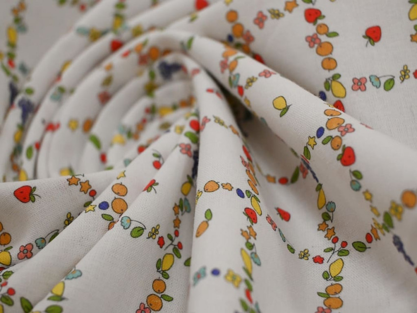 Popelín de algodón 100% con estampado floral y frutal en tonos vivos. Suave, ligero y transpirable, ideal para prendas frescas y llenas de color.