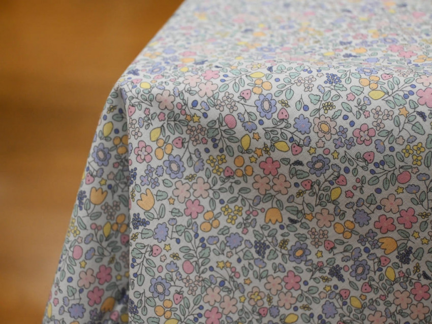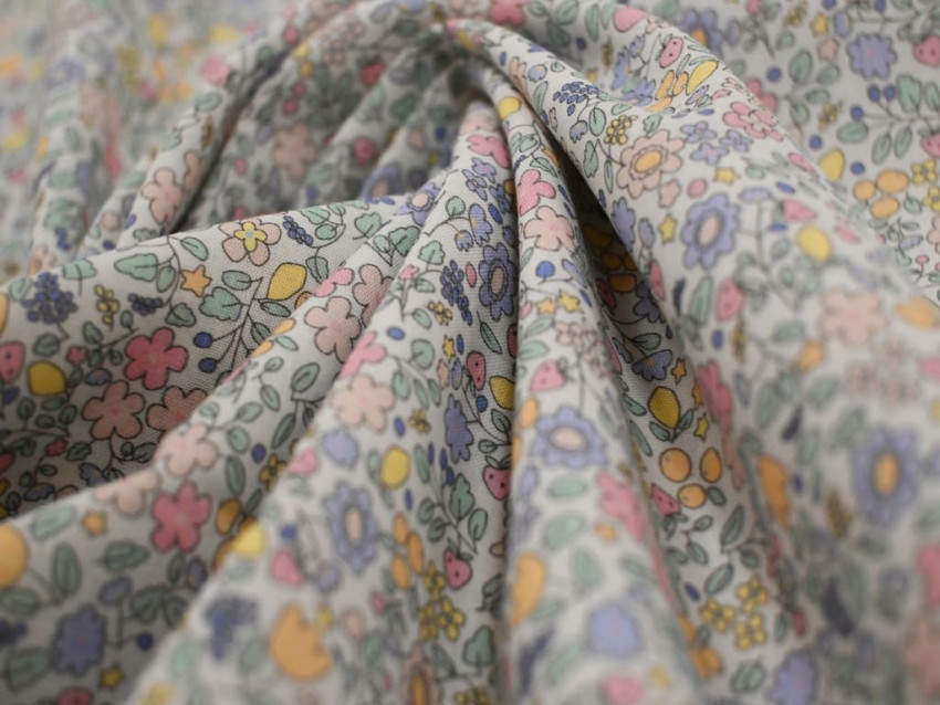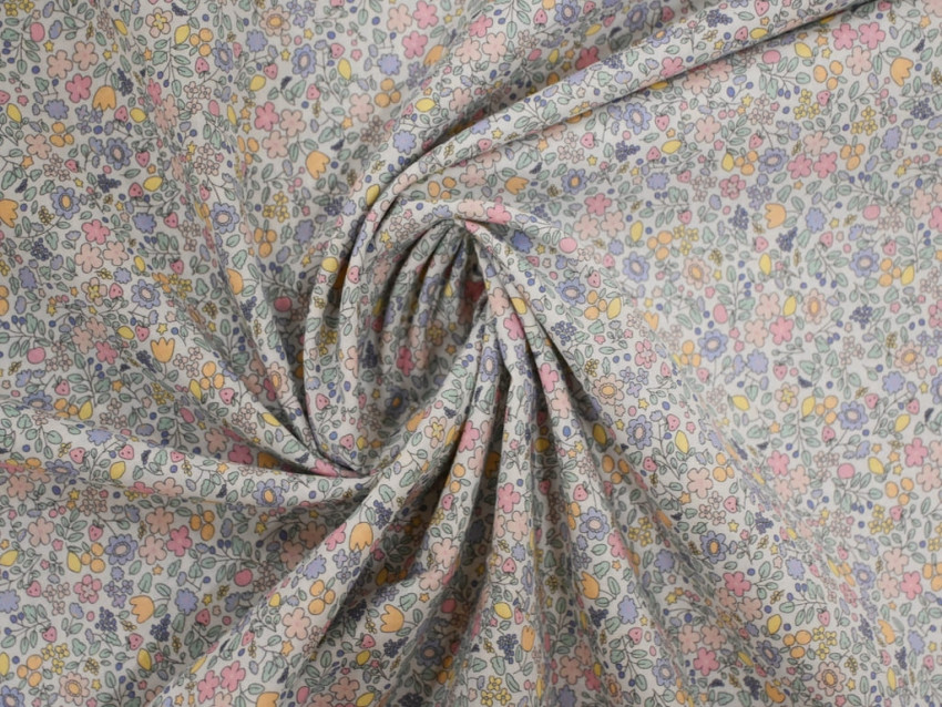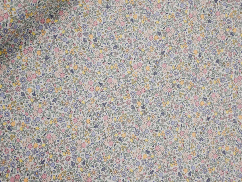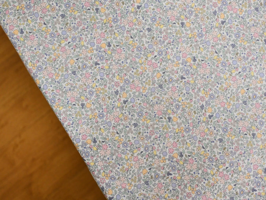 Voile de algodón 100% con estampado floral tipo liberty en tonos pastel. Extra ligero, suave y vaporoso, ideal para prendas delicadas, infantiles y proyectos frescos con caída fluida.