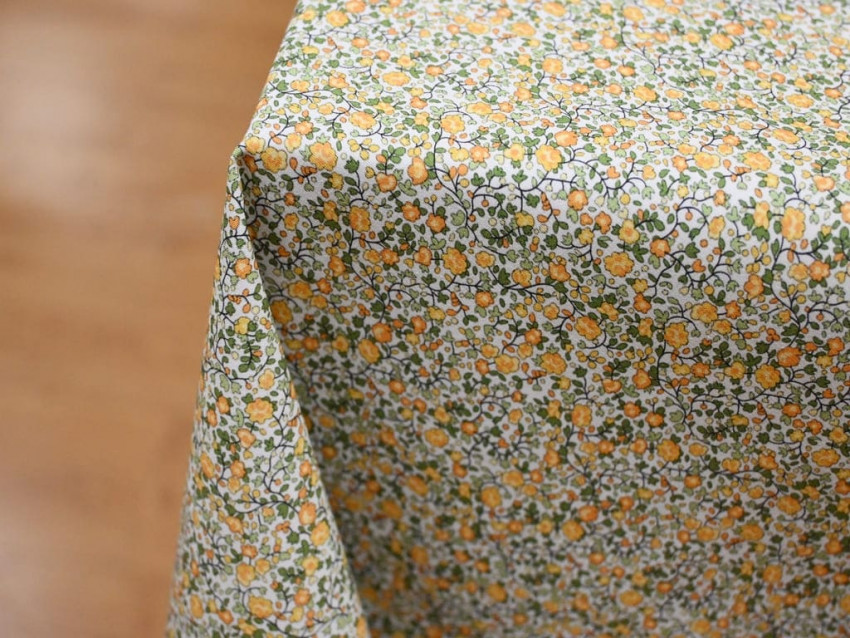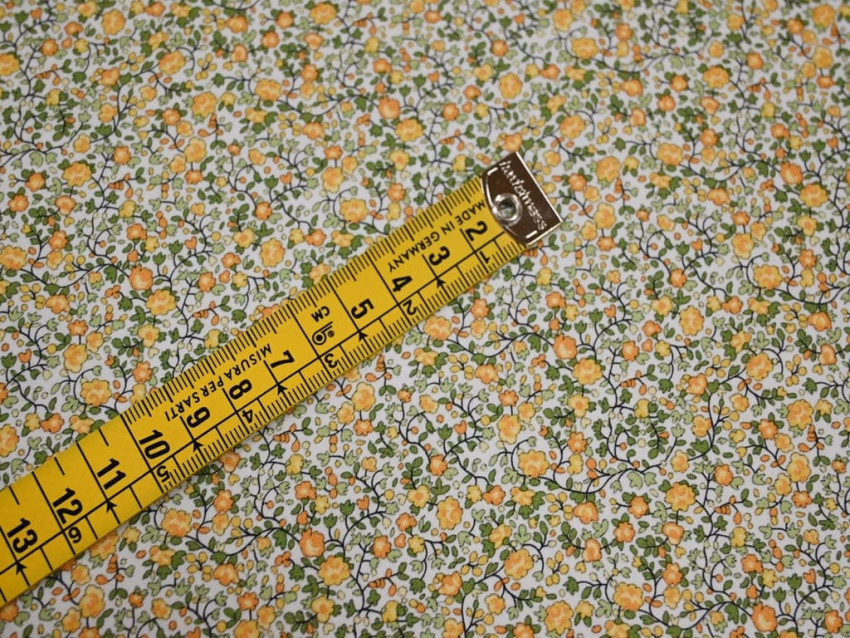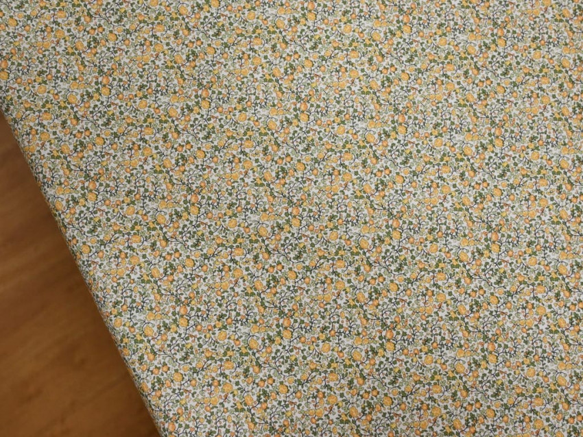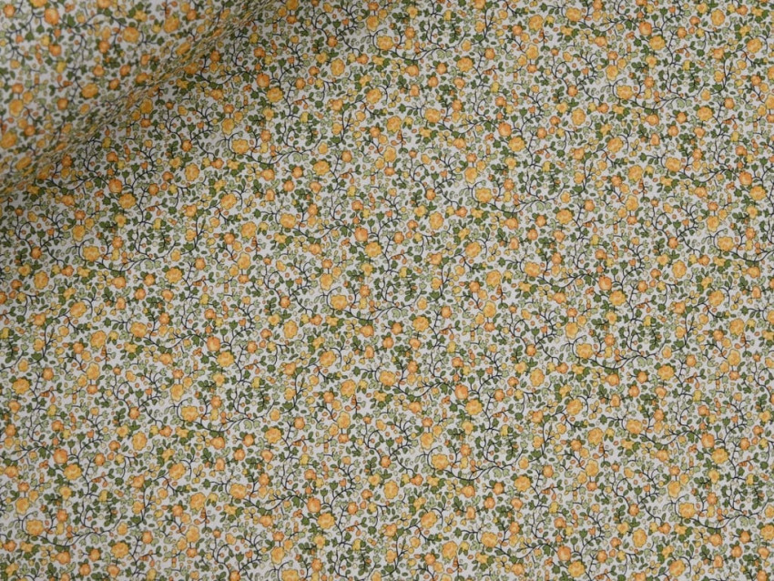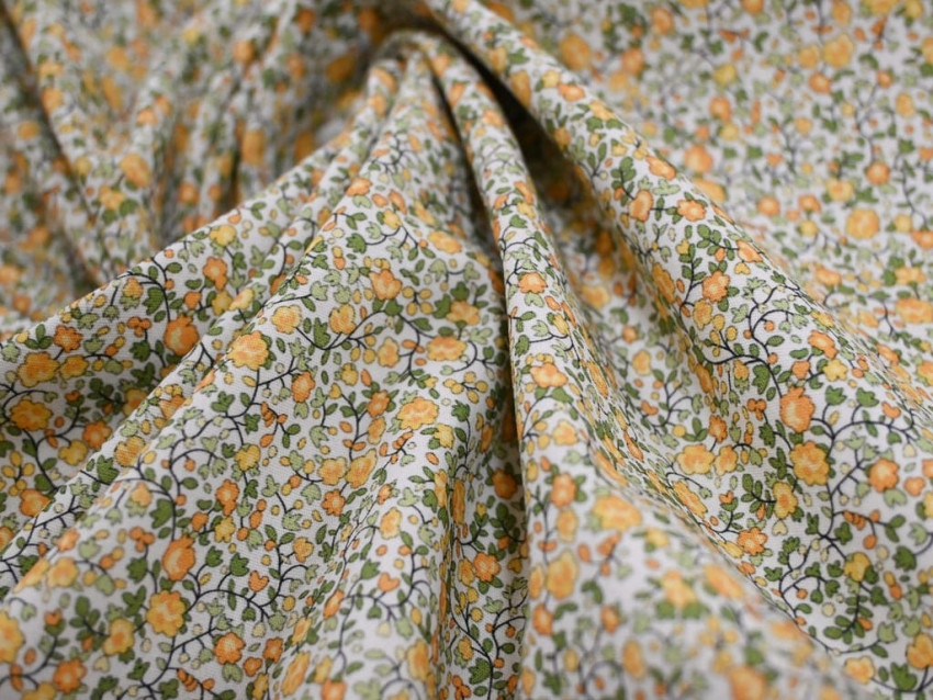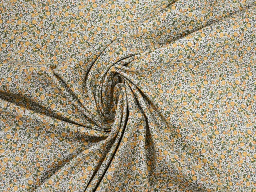 Popelín de algodón 100% con delicado estampado floral tipo liberty en tonos mostaza y verde. Ligero, fresco y con un aire natural, perfecto para prendas suaves y llenas de encanto.