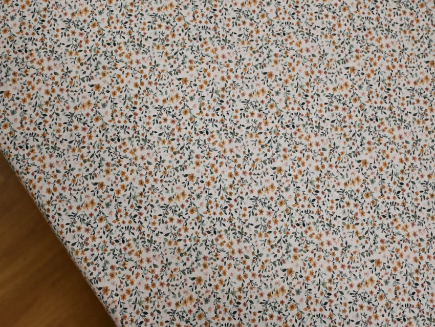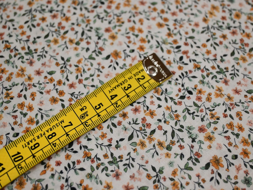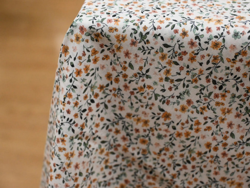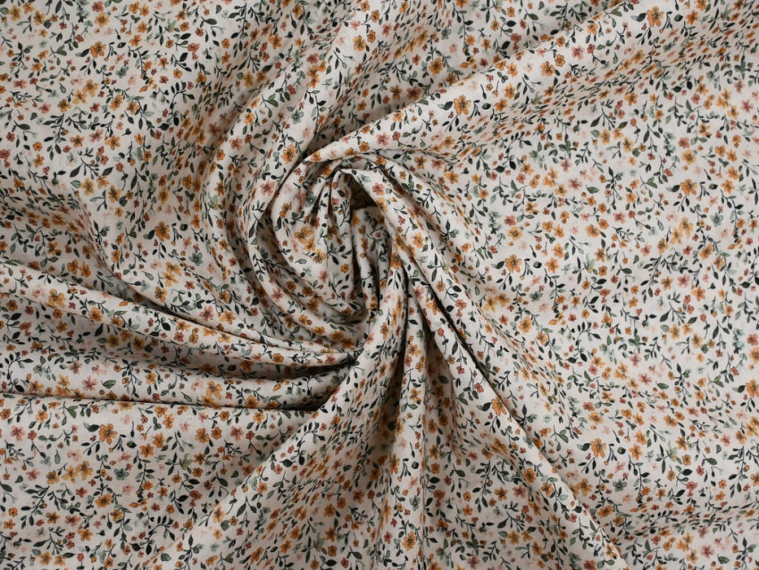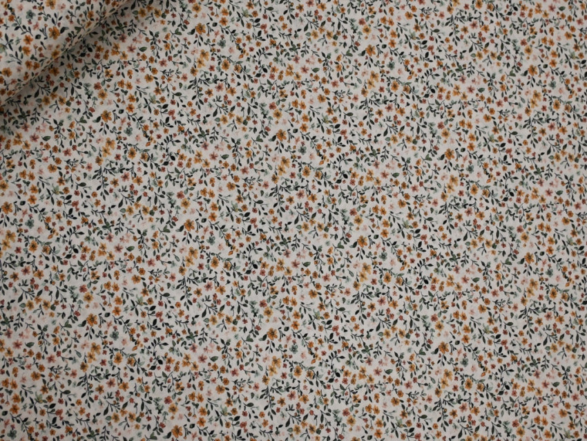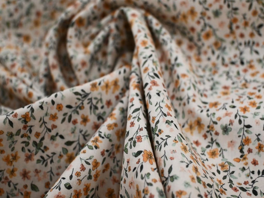 Este voile de algodón 100% destaca por su elegante estampado floral de pequeño formato en tonos cálidos —ocres, tejas suaves y verdes naturales— sobre fondo claro. Un diseño sutil y armonioso que transmite naturalidad, ligereza y un estilo delicado muy actual.
