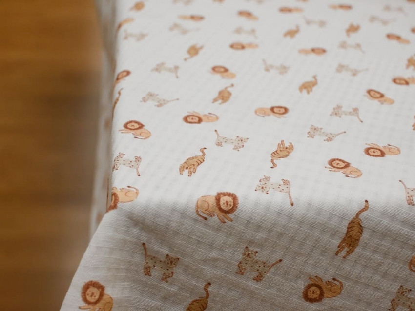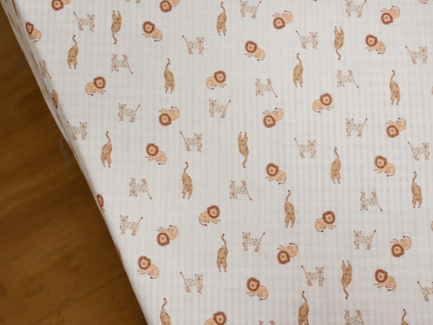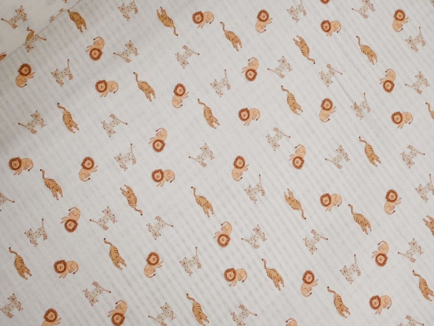 El estampado está compuesto por pequeños animales —leones, jirafas y felinos— dibujados en tonos cálidos y empolvados sobre fondo blanco. El resultado es un diseño equilibrado, dulce y muy versátil para confección infantil, alejándose de lo excesivamente saturado y aportando elegancia dentro del estilo baby.