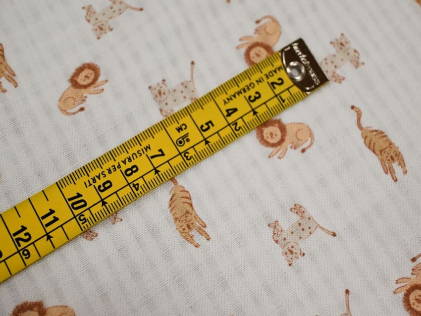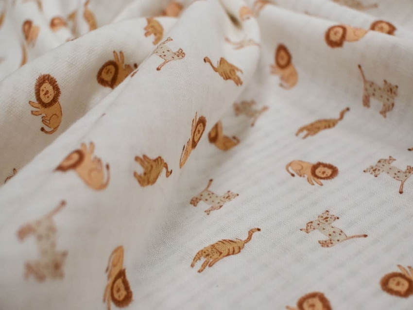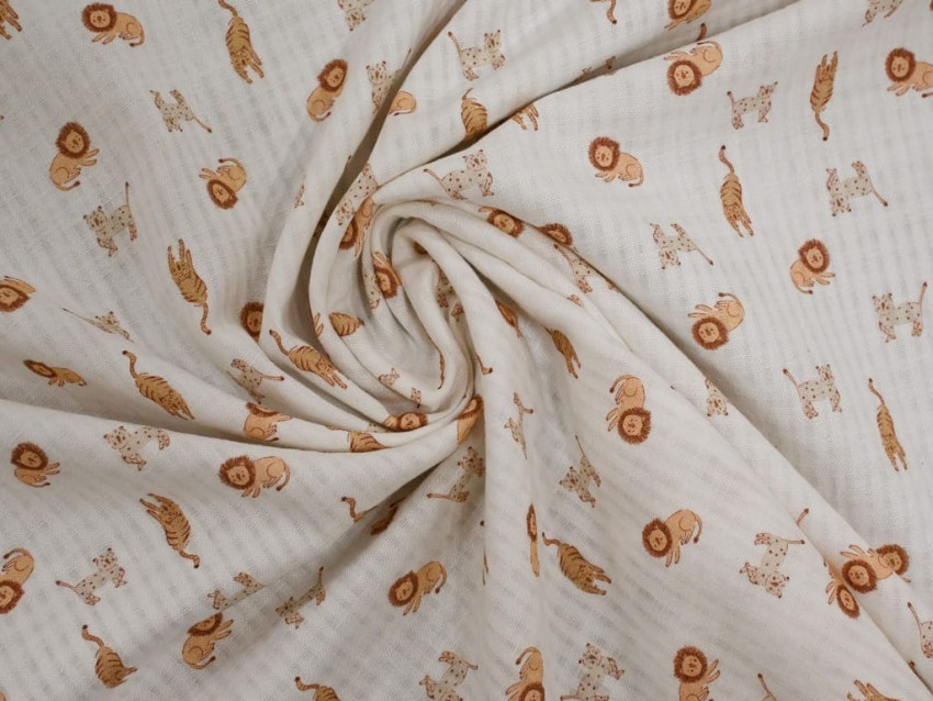 Muselina de algodón 100% con estampado infantil de animales sobre base blanca con textura cuadriculada. Ligera, suave y transpirable, perfecta para confección de bebé y prendas delicadas con un toque dulce y natural.