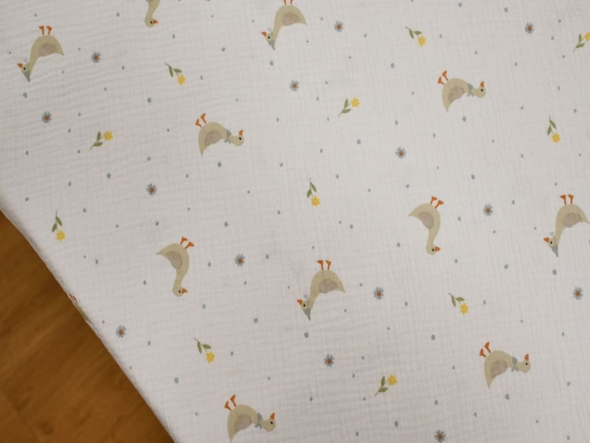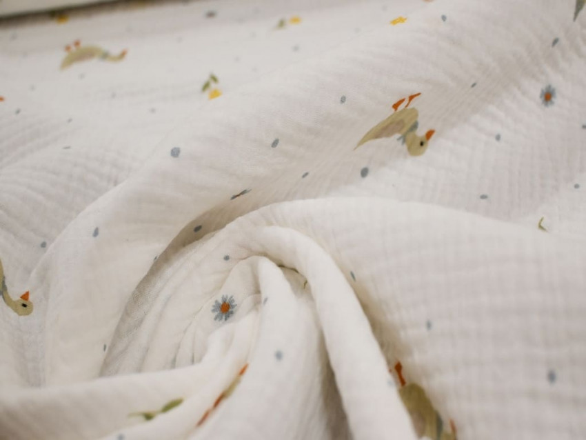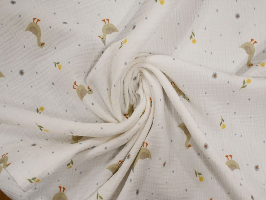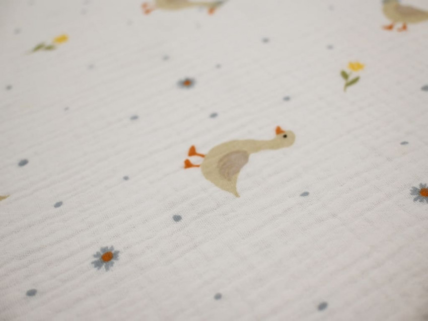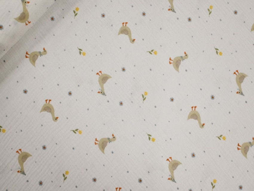 Muselina o doble gasa 100% algodón con encantador estampado de patitos y pequeñas flores. Suave, ligera y transpirable, perfecta para confección infantil delicada y confortable.
