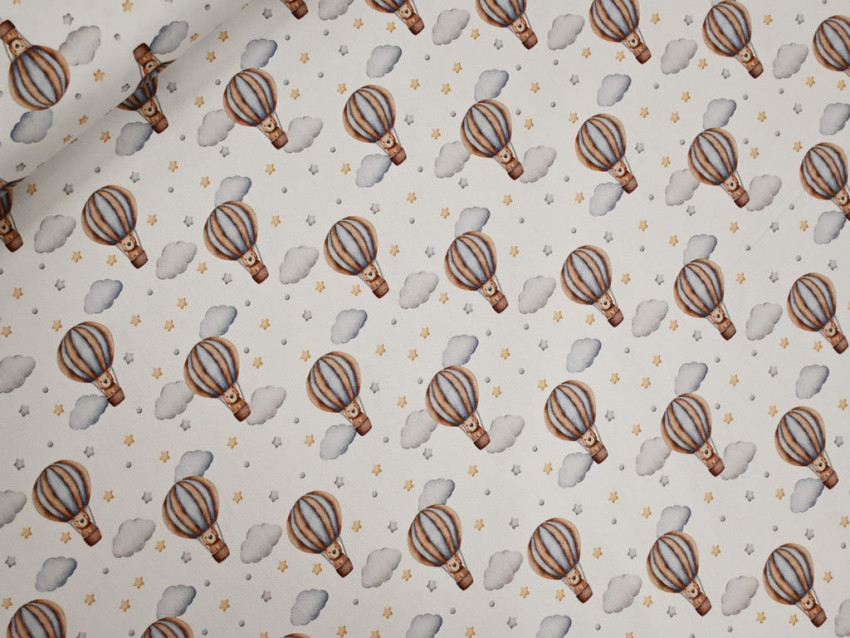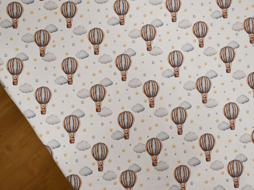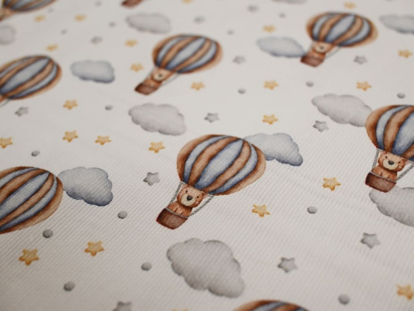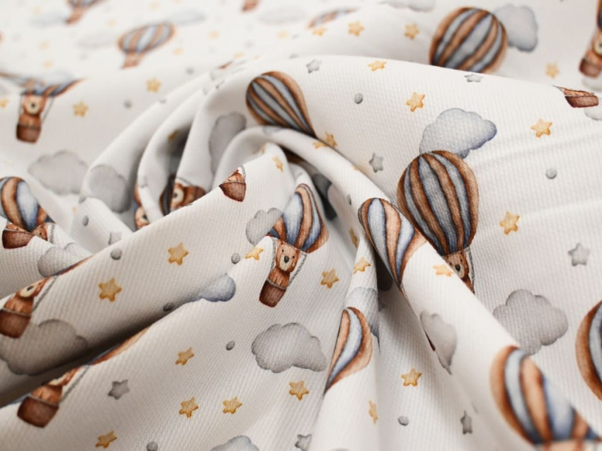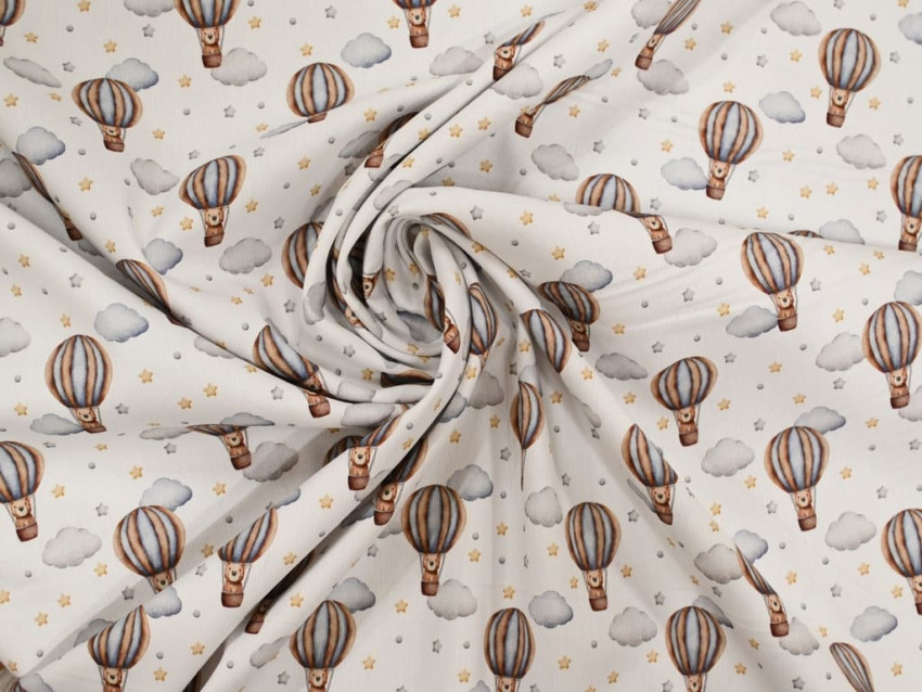 Piqué canutillo 100% algodón con encantador estampado de globos aerostáticos, nubes y estrellas. Tejido con relieve, transpirable y con cuerpo, ideal para confección infantil.