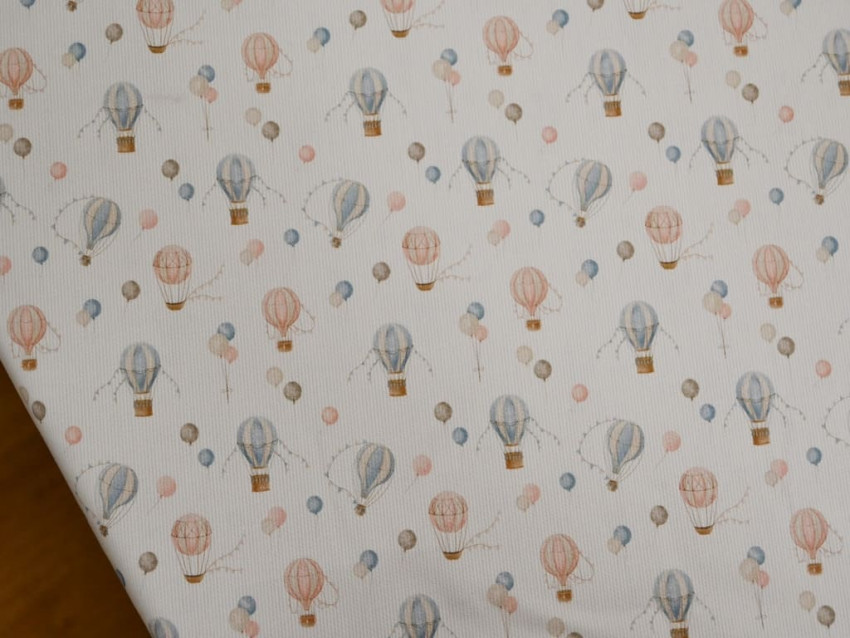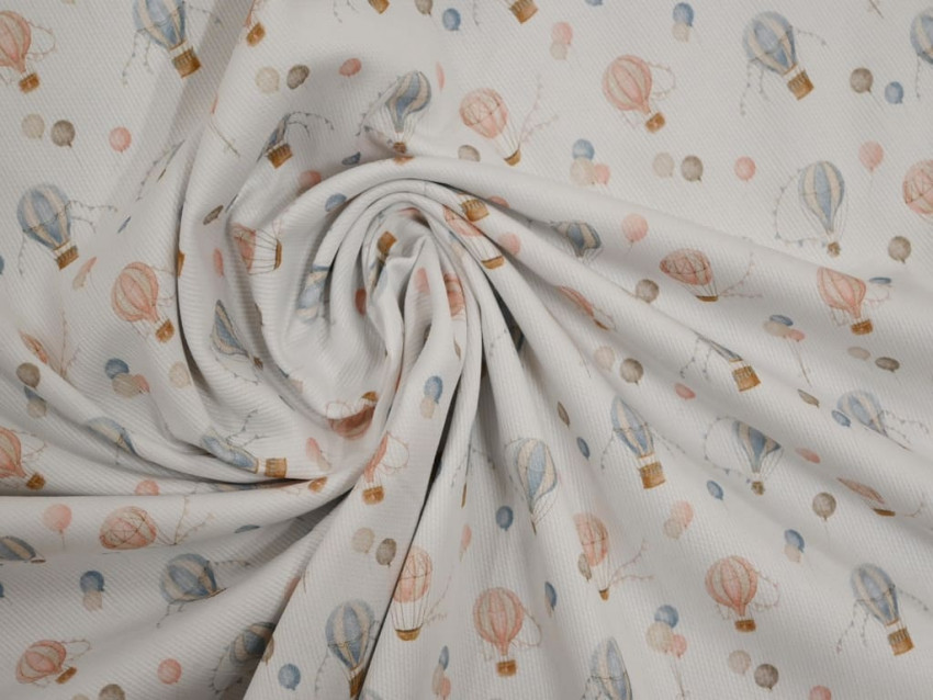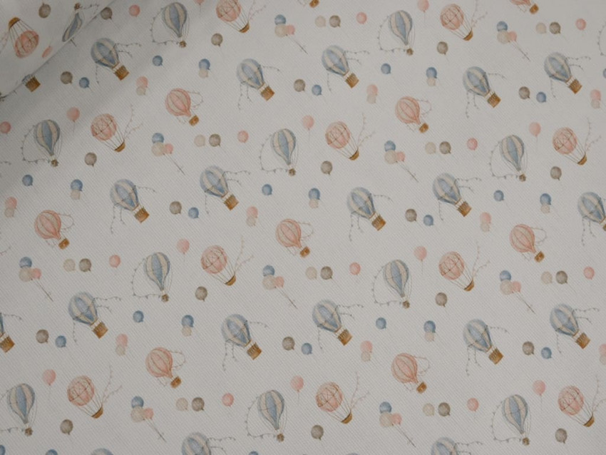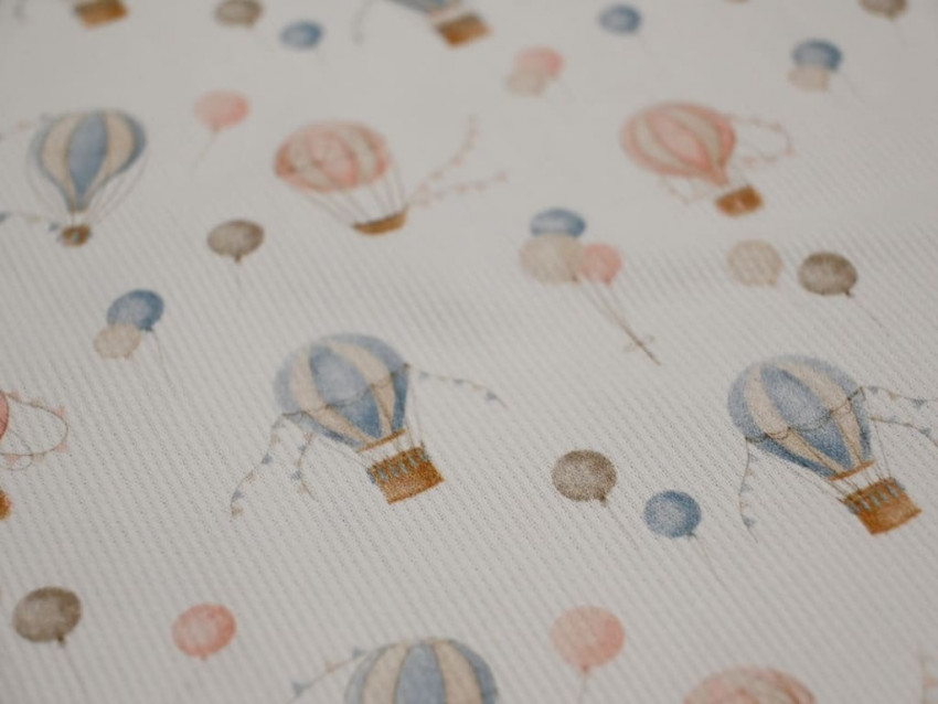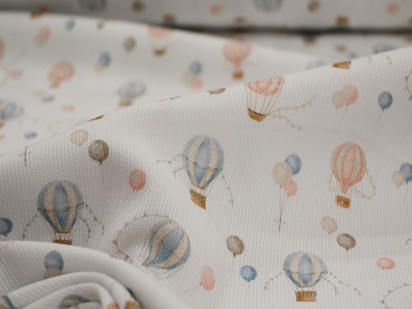 Piqué canutillo 100% algodón con delicado estampado de globos aerostáticos en tonos empolvados. Suave, transpirable y con textura en relieve, ideal para bebé. Ancho 150 cm, 150 gr/m².