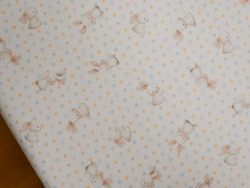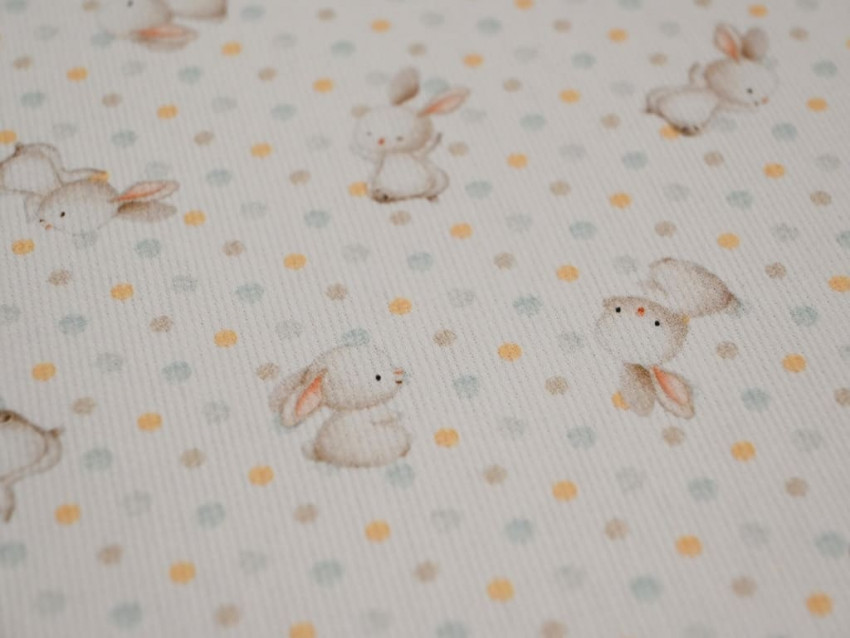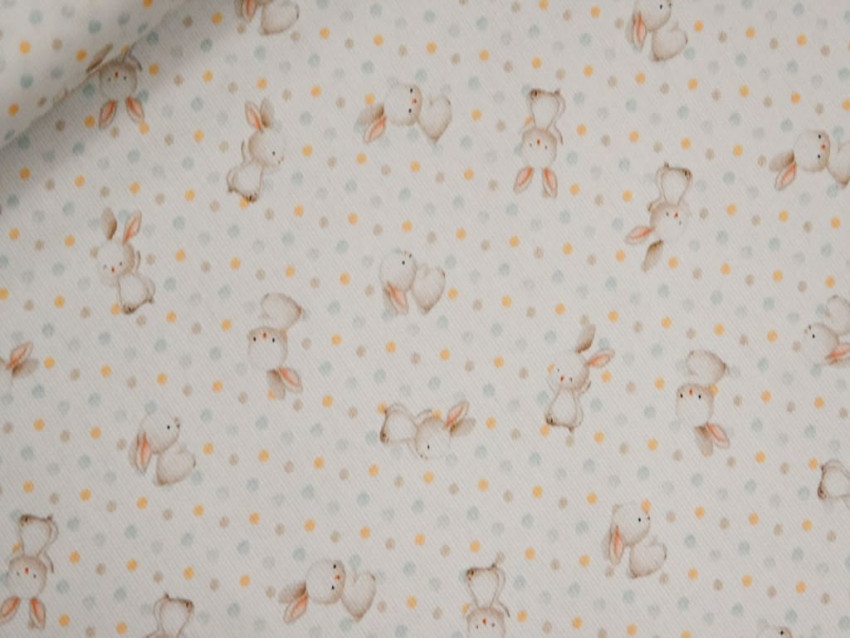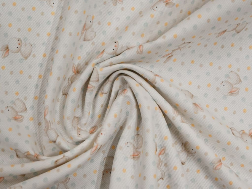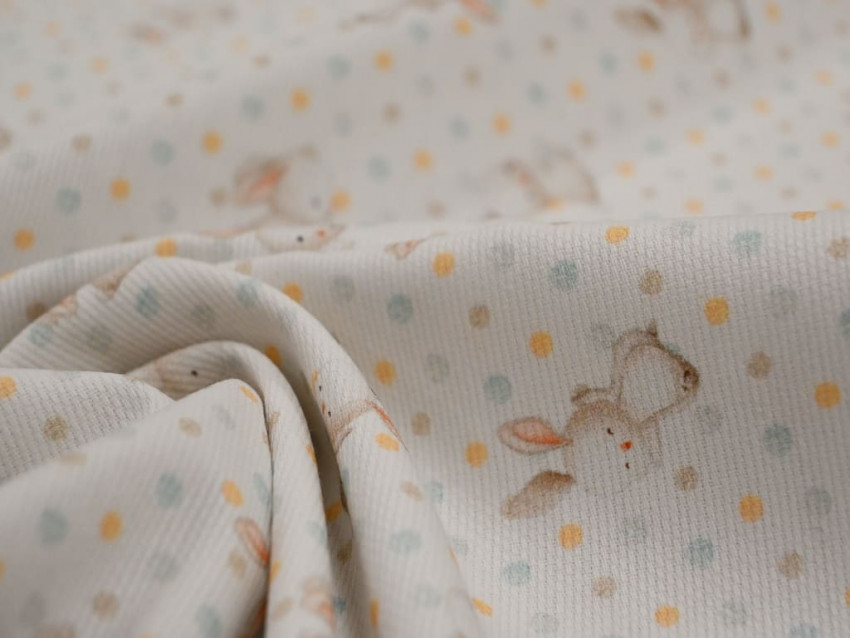Piqué canutillo 100% algodón con estampado infantil de conejitos sobre fondo de lunares suaves. Textura en relieve, delicado, transpirable y perfecto para bebé. Ancho 150 cm, 150 gr/m².