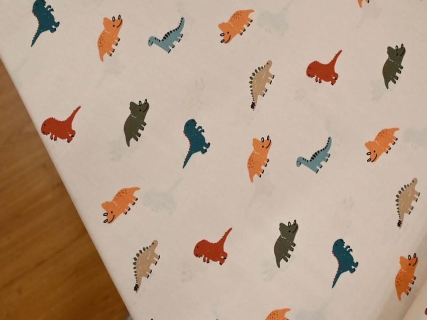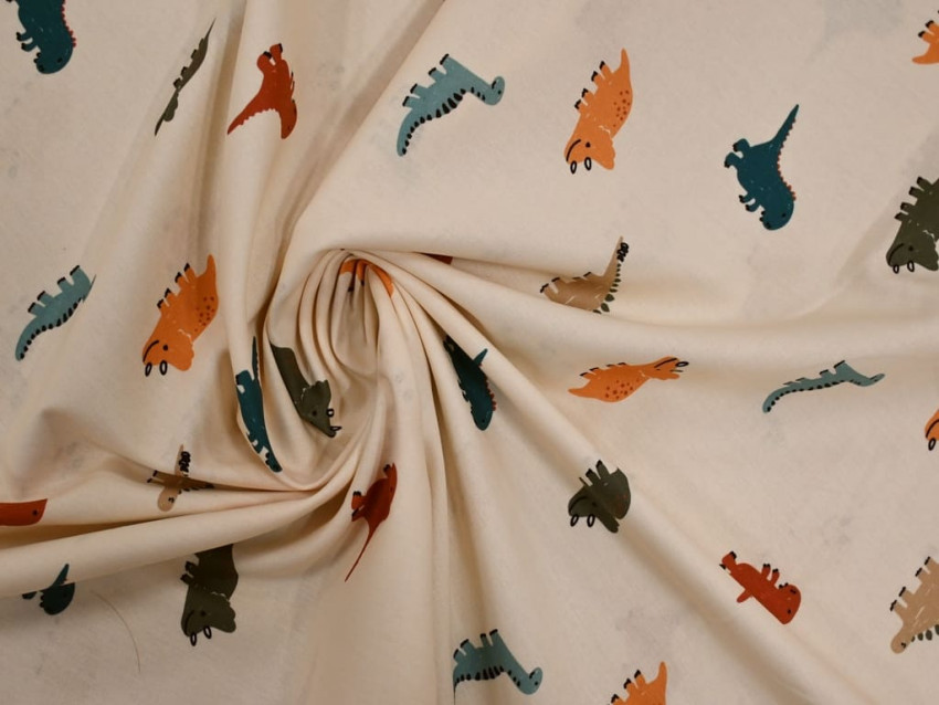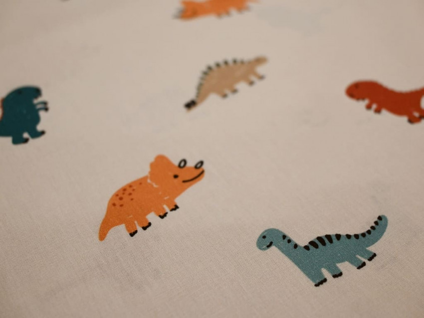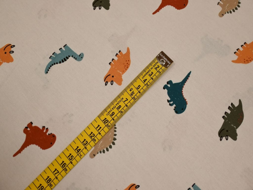 Este popelín de algodón 100% presenta un encantador diseño de pequeños dinosaurios en tonos alegres sobre fondo claro. Un tejido pensado para despertar la imaginación y aportar comodidad en prendas infantiles y accesorios.