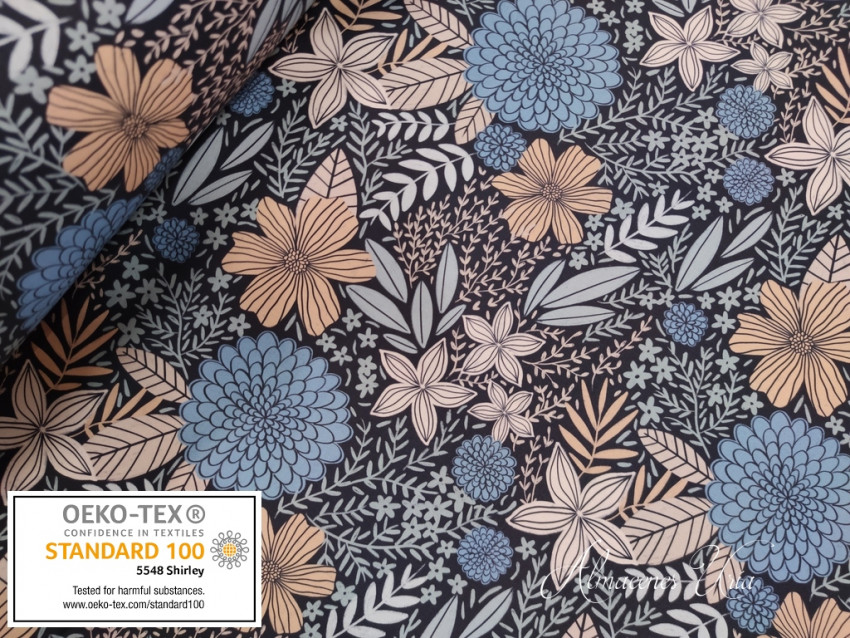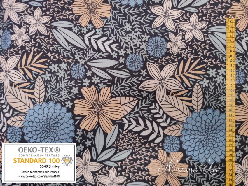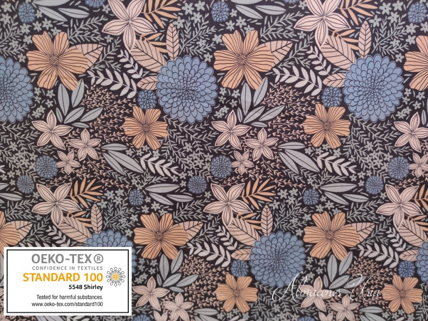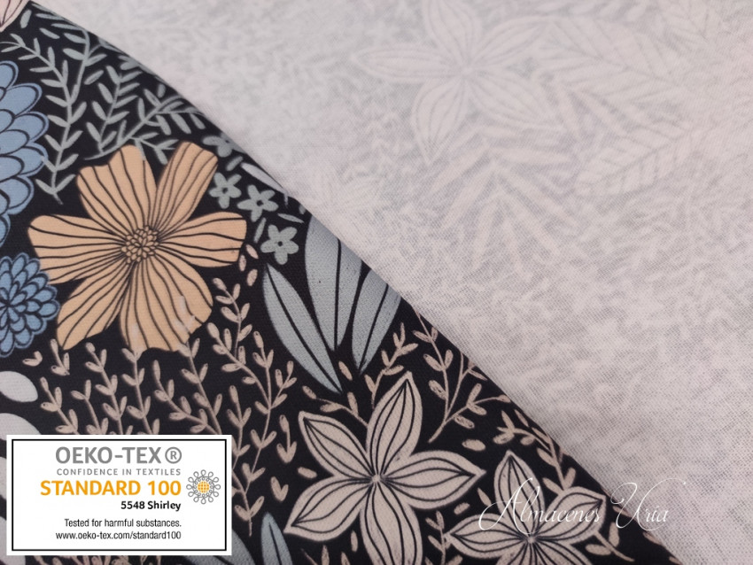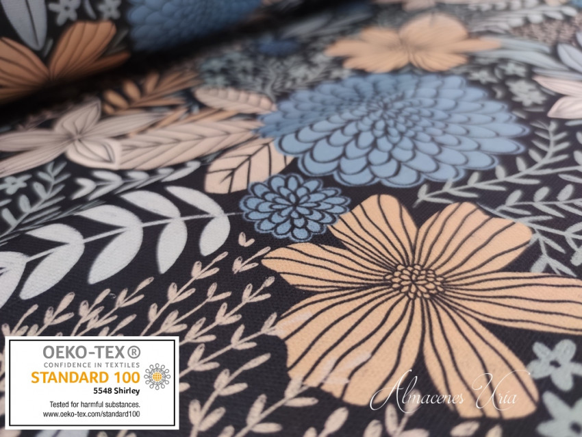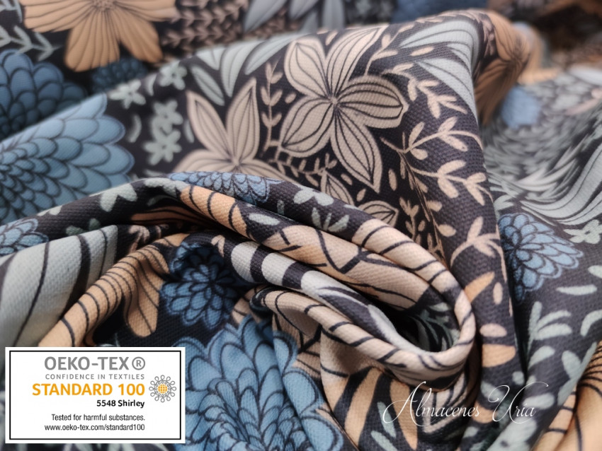 Loneta estampada de algodón, con cuerpo, rigidez y tacto suave.