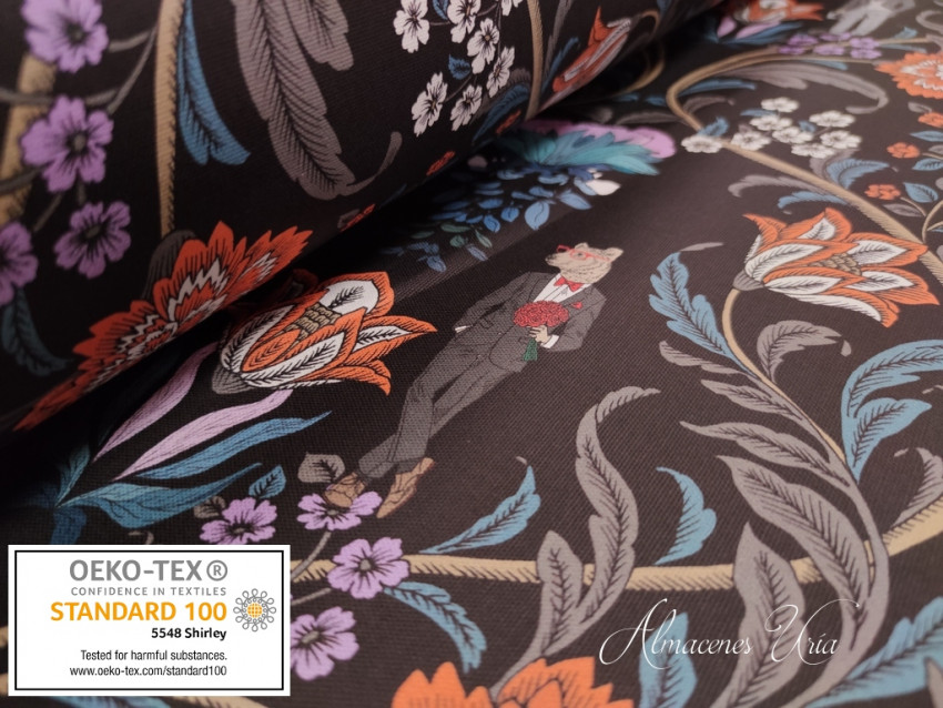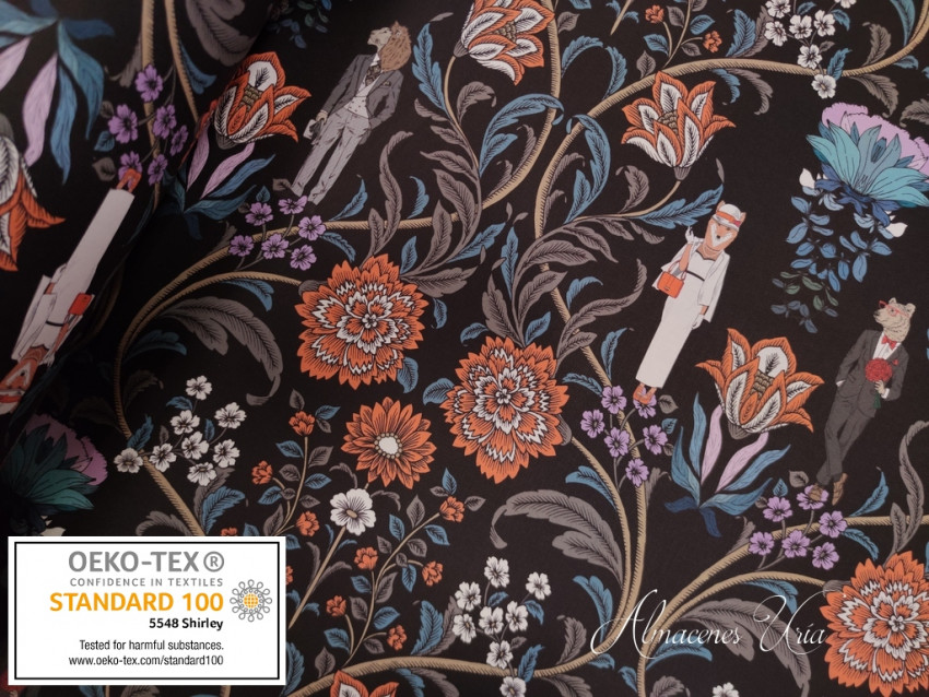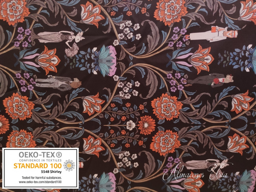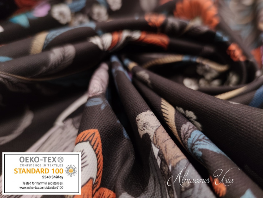 Loneta estampada de algodón, con cuerpo, rigidez y tacto suave.