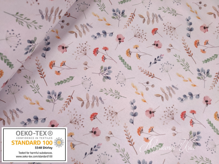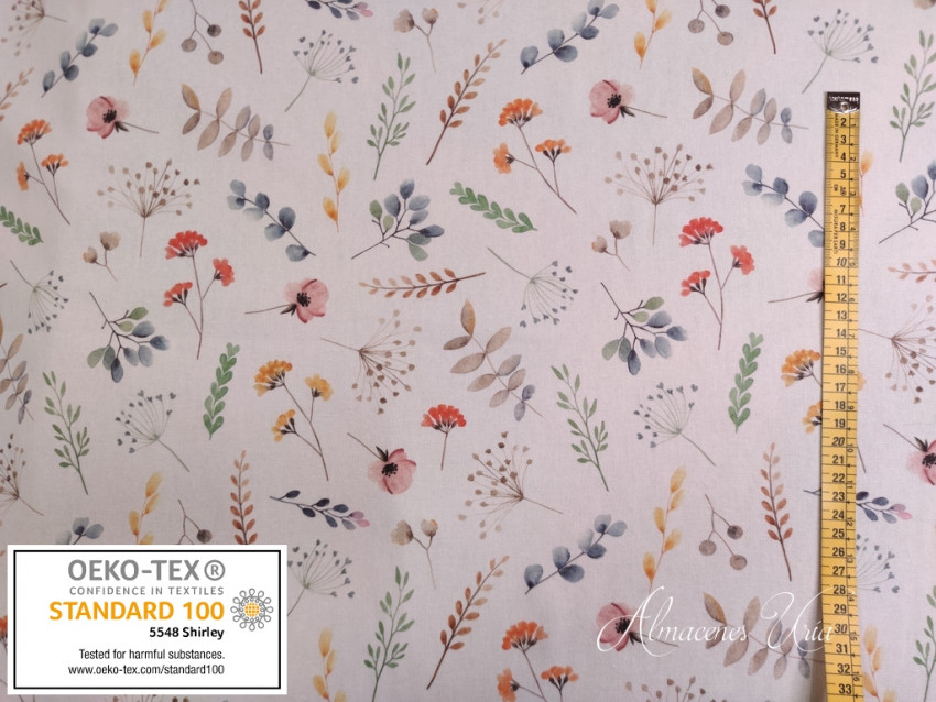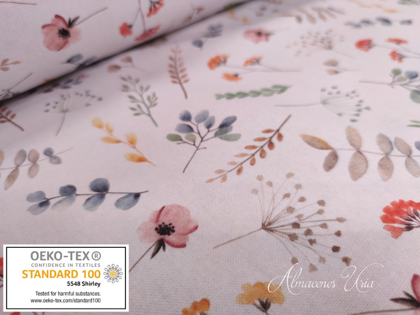 Loneta estampada de algodón con cuerpo, rigidez, resiete y suave.