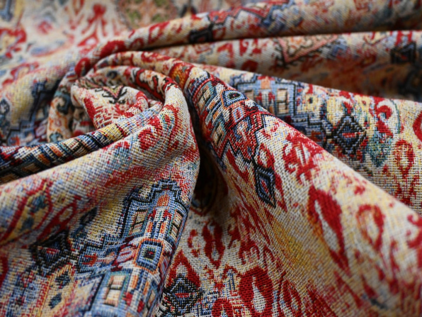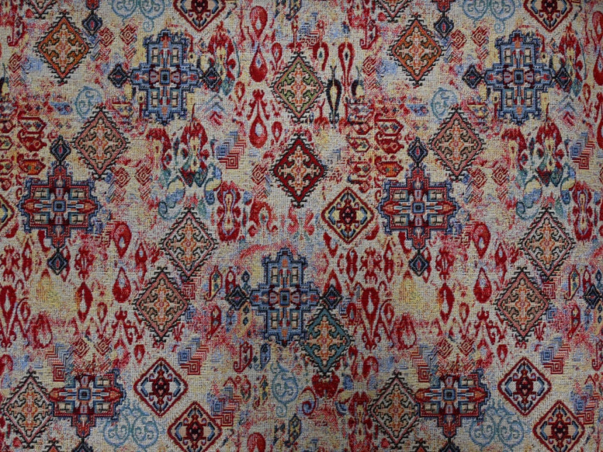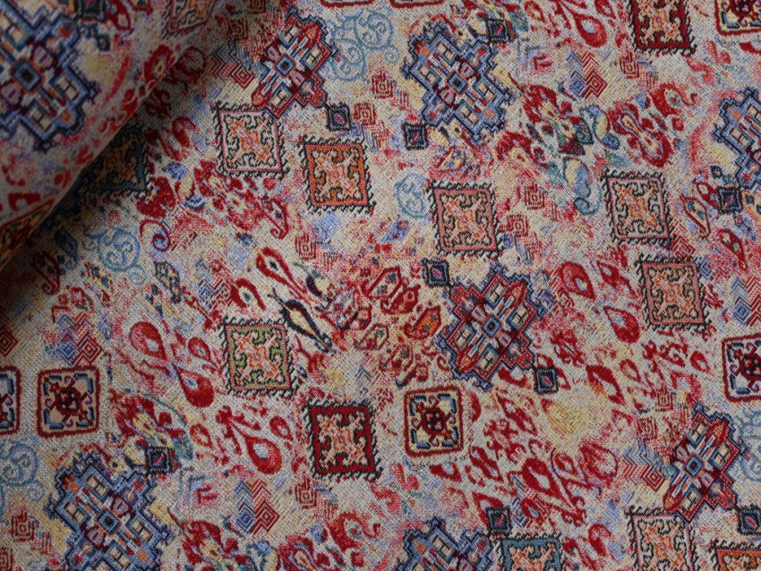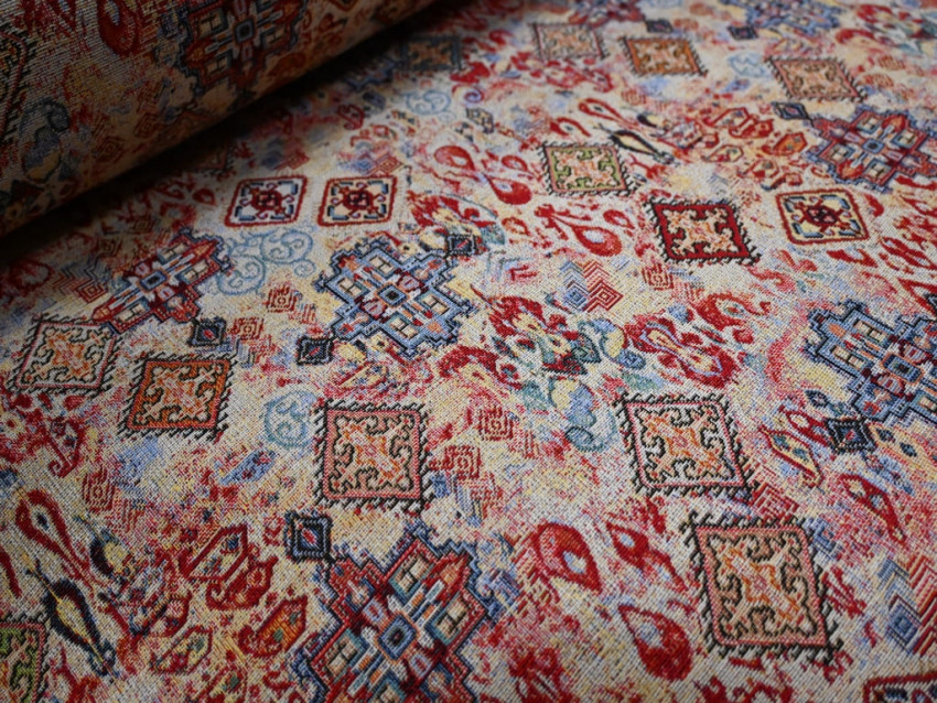 Gobelín de 280 cm de ancho, tejido grueso y resistente con un diseño étnico sofisticado.