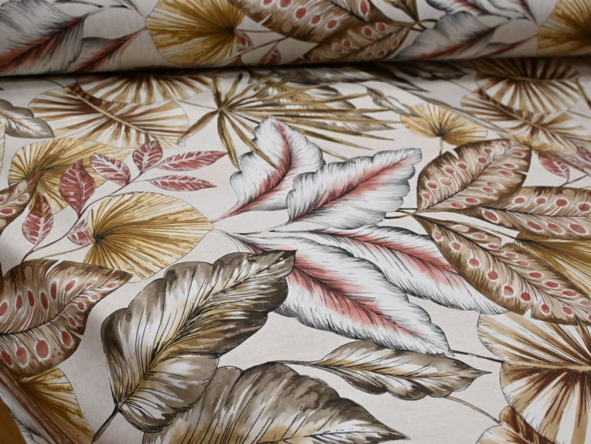 Su diseño de hojas tropicales en tonos tierra, beige y coral aporta un estilo elegante y natural. Ideal para cortinas, cojines, tapicería ligera y decoración del hogar.