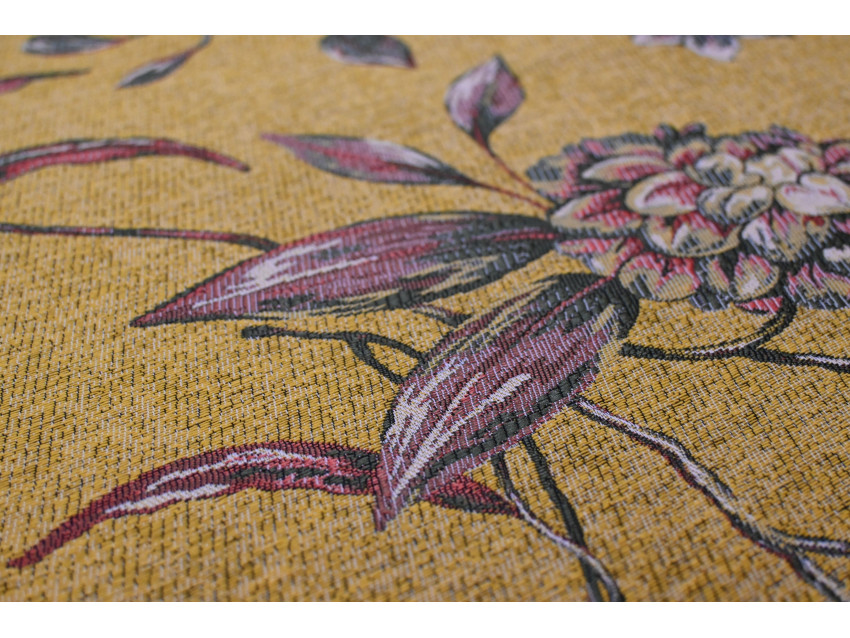 Este Jacquard de 280 cm de ancho, confeccionado en 100% poliéster, es una pieza textil de gran impacto visual y alta durabilidad. Su diseño ornamental presenta majestuosos pavos reales con plumas ricamente detalladas, rodeados de flores en tonos burdeos, rosa y negro sobre un fondo mostaza texturizado, creando un contraste elegante y sofisticado.