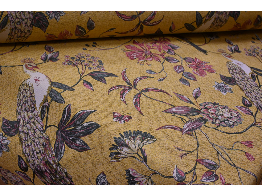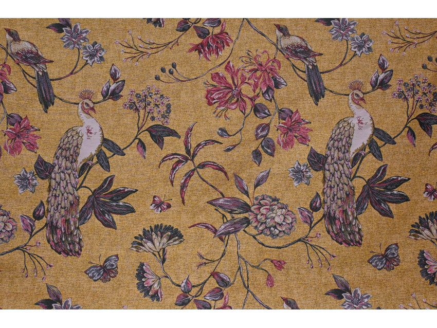 Tela Jacquard de 280 cm de ancho en 100% poliéster, con un lujoso estampado de pavos reales, mariposas y flores en tonos burdeos y rosados sobre un fondo mostaza texturizado.