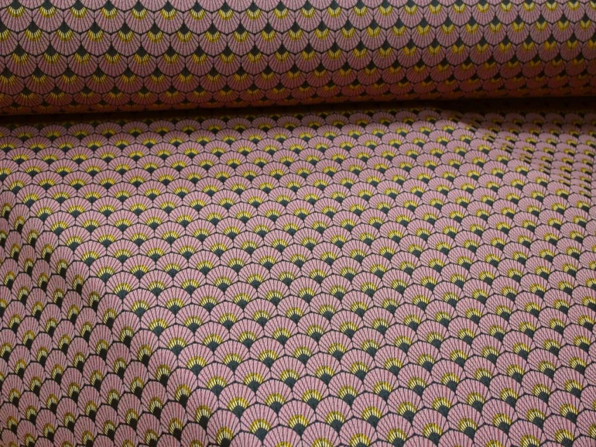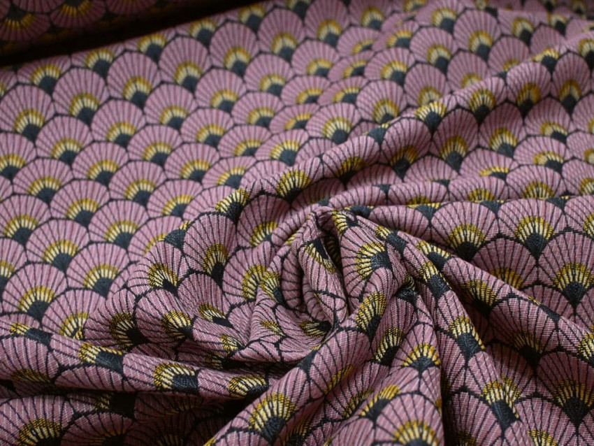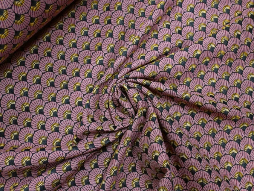Este Jacquard de 280 cm de ancho, fabricado en 100% poliéster, combina elegancia y resistencia en un tejido decorativo de alta calidad. Su diseño geométrico en forma de abanicos de inspiración Art Déco, en tonos malva, negro y dorado, aporta un aire sofisticado y retro, perfecto para interiores modernos y clásicos.