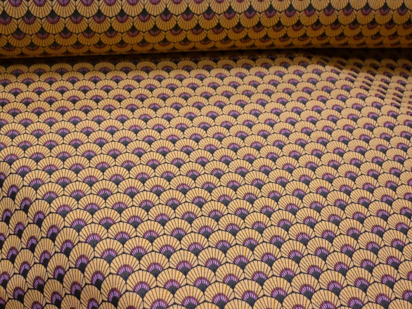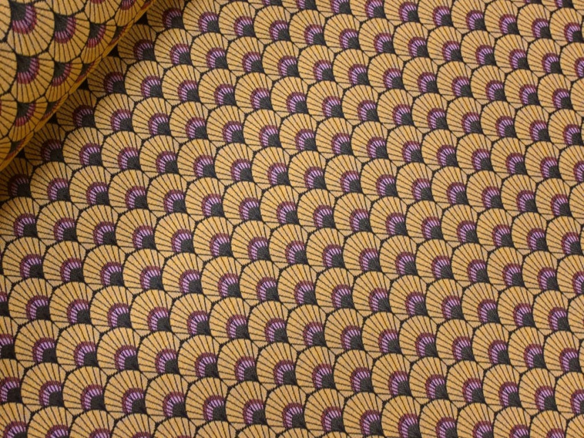 Tela Jacquard de 280 cm de ancho en 100% poliéster, con un estampado geométrico de inspiración Art Déco en tonos mostaza, negro y morado.