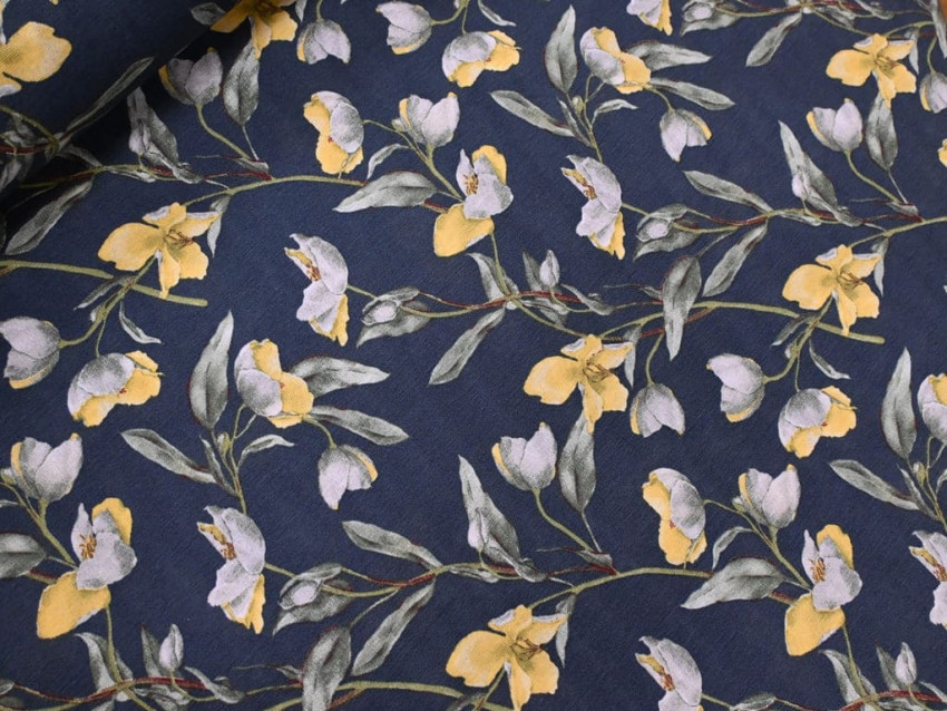 El estampado floral, con flores amarillas y blancas sobre un fondo azul marino, aporta un toque sofisticado y atemporal, perfecto para decoración de interiores. Su tejido de gramaje medio-alto garantiza durabilidad y fácil mantenimiento, siendo apto para uso frecuente sin perder calidad.