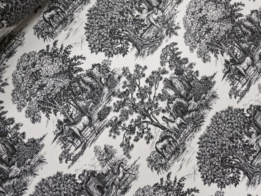 Esta loneta 100% algodón con estampado toile de Jouy en negro combina el clasicismo francés con la elegancia del blanco y negro. Con un ancho extra de 280 cm y un gramaje de 210 gr/m², es perfecta para proyectos decorativos de gran formato, sin necesidad de empalmes y con un acabado profesional.