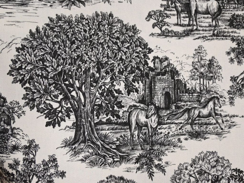 Loneta 100% algodón con estampado toile de Jouy en negro sobre fondo crudo.