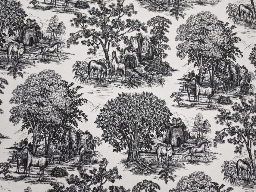 El diseño representa escenas de campo, caballos y árboles en estilo ilustrado, ofreciendo un efecto visual impactante y refinado. Ideal para ambientes modernos con guiños vintage, o para combinar con decoraciones monocromáticas o contrastadas.