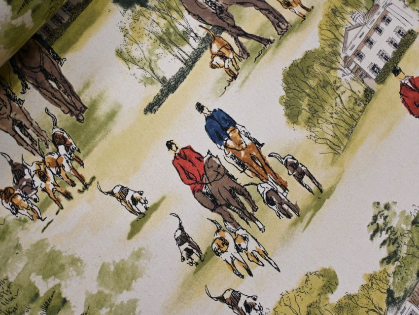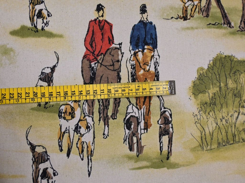 Esta loneta estampada de inspiración ecuestre destaca por su diseño lleno de movimiento y elegancia: jinetes a caballo, sabuesos, mansiones y paisajes de campo recrean una escena clásica británica con un aire sofisticado y muy decorativo. El tejido está confeccionado en 100% algodón, con un gramaje superior de 250 gr/m² y un ancho generoso de 280 cm, ideal para proyectos de decoración de gran formato.