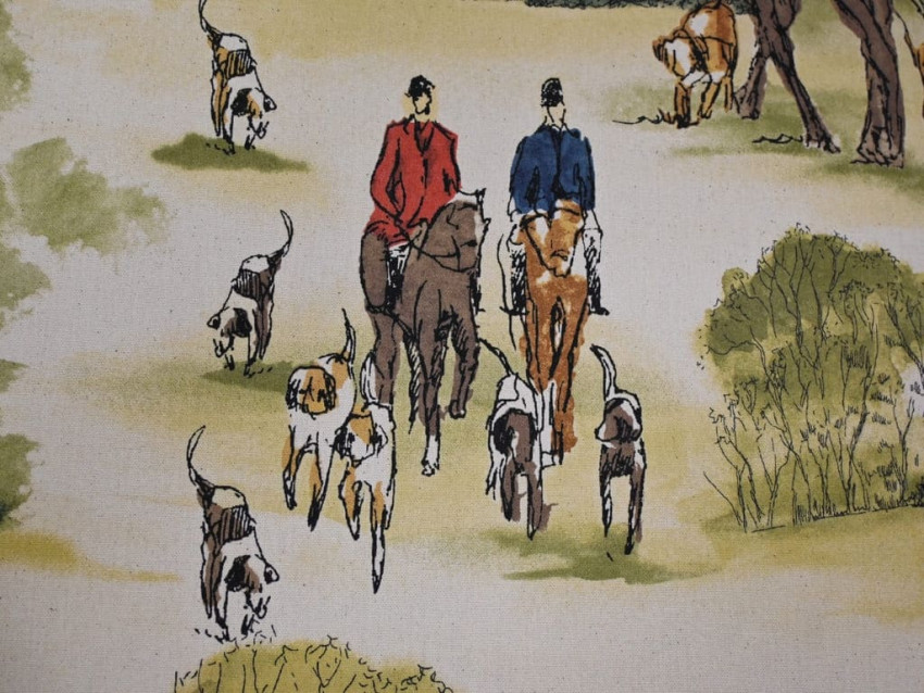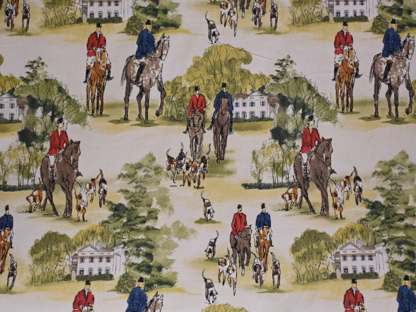 Loneta estampada 100% algodón con escena ecuestre al estilo inglés.