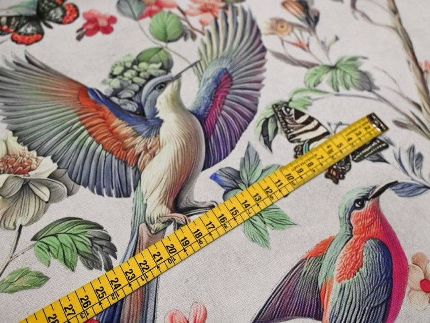 Loneta 100% algodón con exuberante estampado floral, mariposas y aves tropicales.