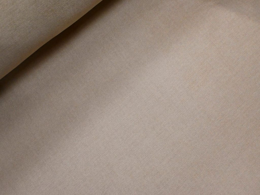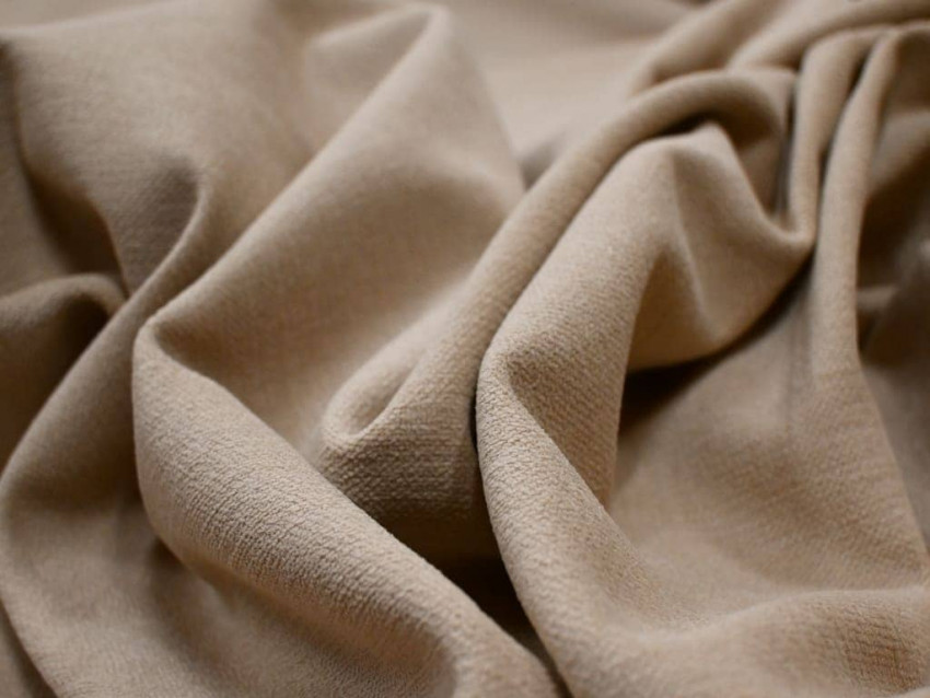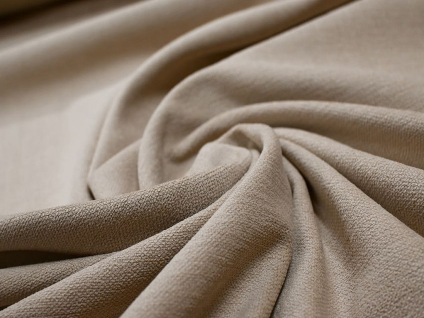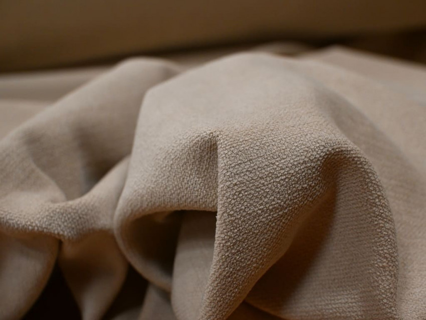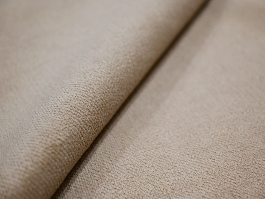 El beige arena aporta claridad y sensación de amplitud. Micro-chenilla de pelo muy corto con tacto peach-skin mate y compacto. Caída controlada: tapiza curvas y superficies planas sin arrugas.