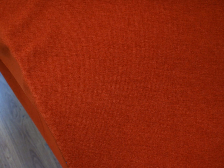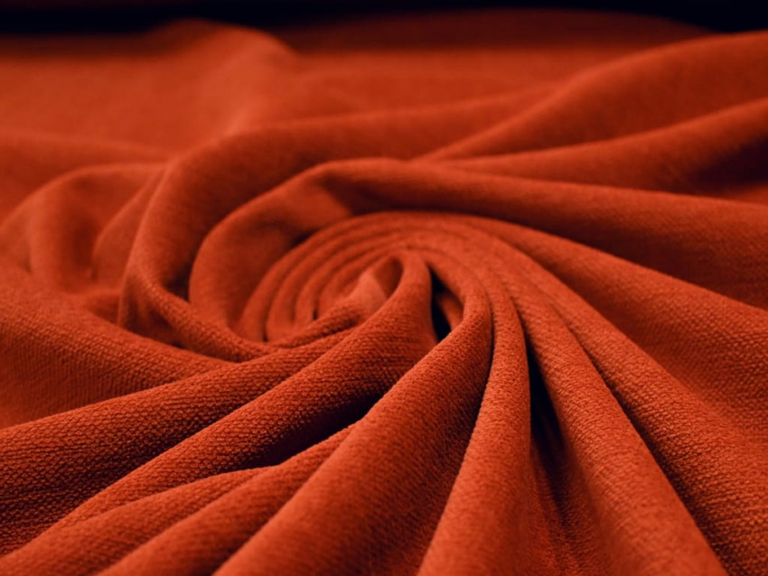 Chenilla premium terracota caldera, 100 % poliéster (450 g/m²) y 200 000 ciclos Martindale.